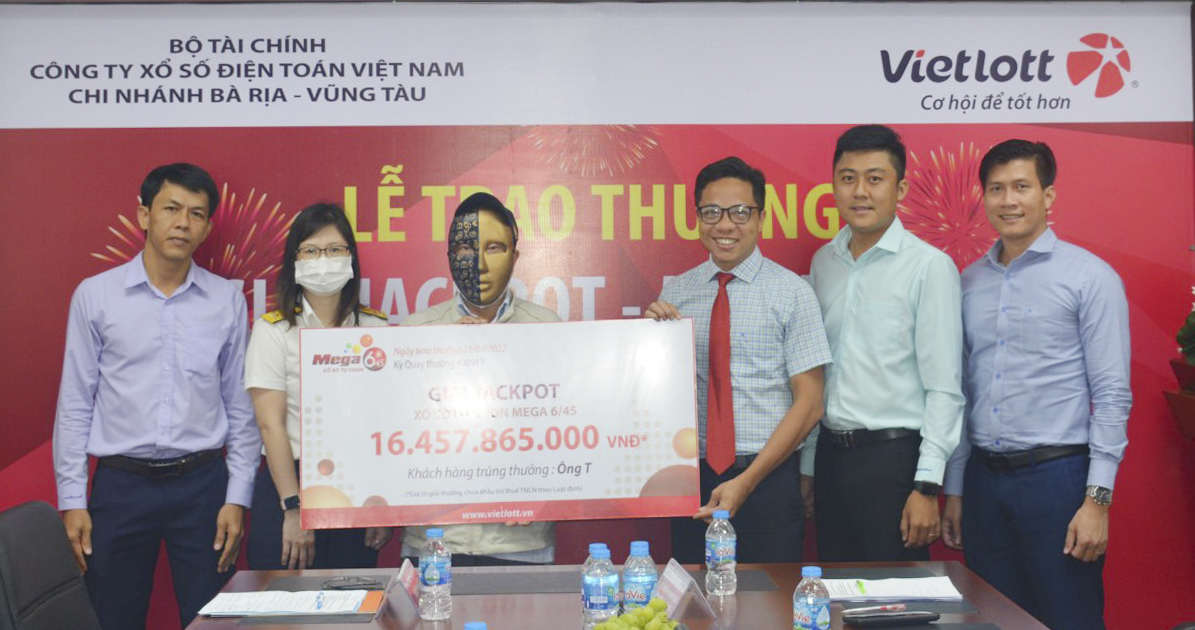 Ngày 21/7, Công ty Xổ số điện toán Việt Nam (Vietlott) Chi nhánh BR-VT (04, Trần Hưng Đạo, phường 3, TP.Vũng Tàu) trao thưởng số tiền hơn 16,4 tỷ đồng cho khách hàng trúng thưởng giải Jackpot sản phẩm Mage 6/45 ở kỳ quay số mở thưởng 00913 ngày 13/7.