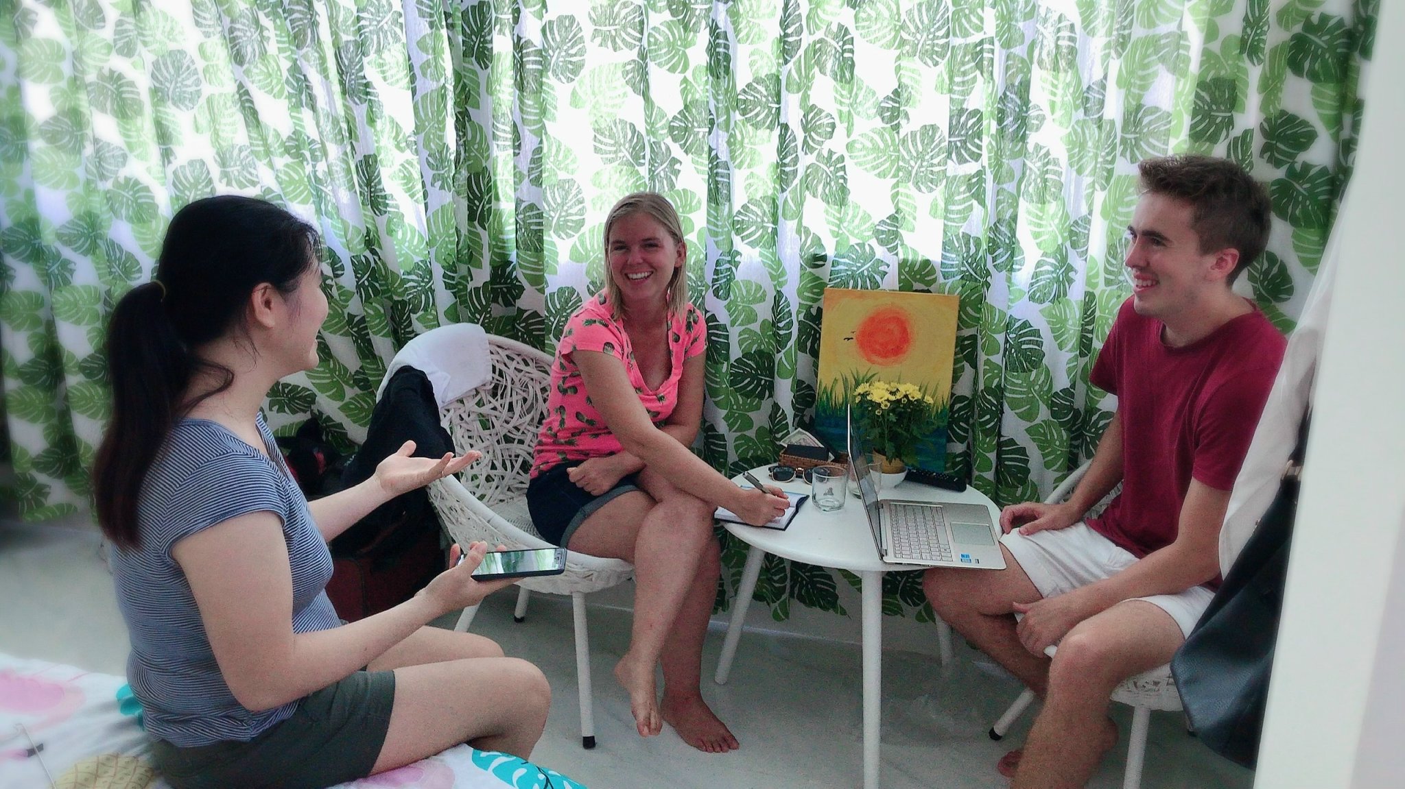 | Chủ một cơ sở “homestay” trên đường Phan Chu Trinh trò chuyện với khách du lịch nước ngoài khi họ cùng lưu trú trong nhà. |