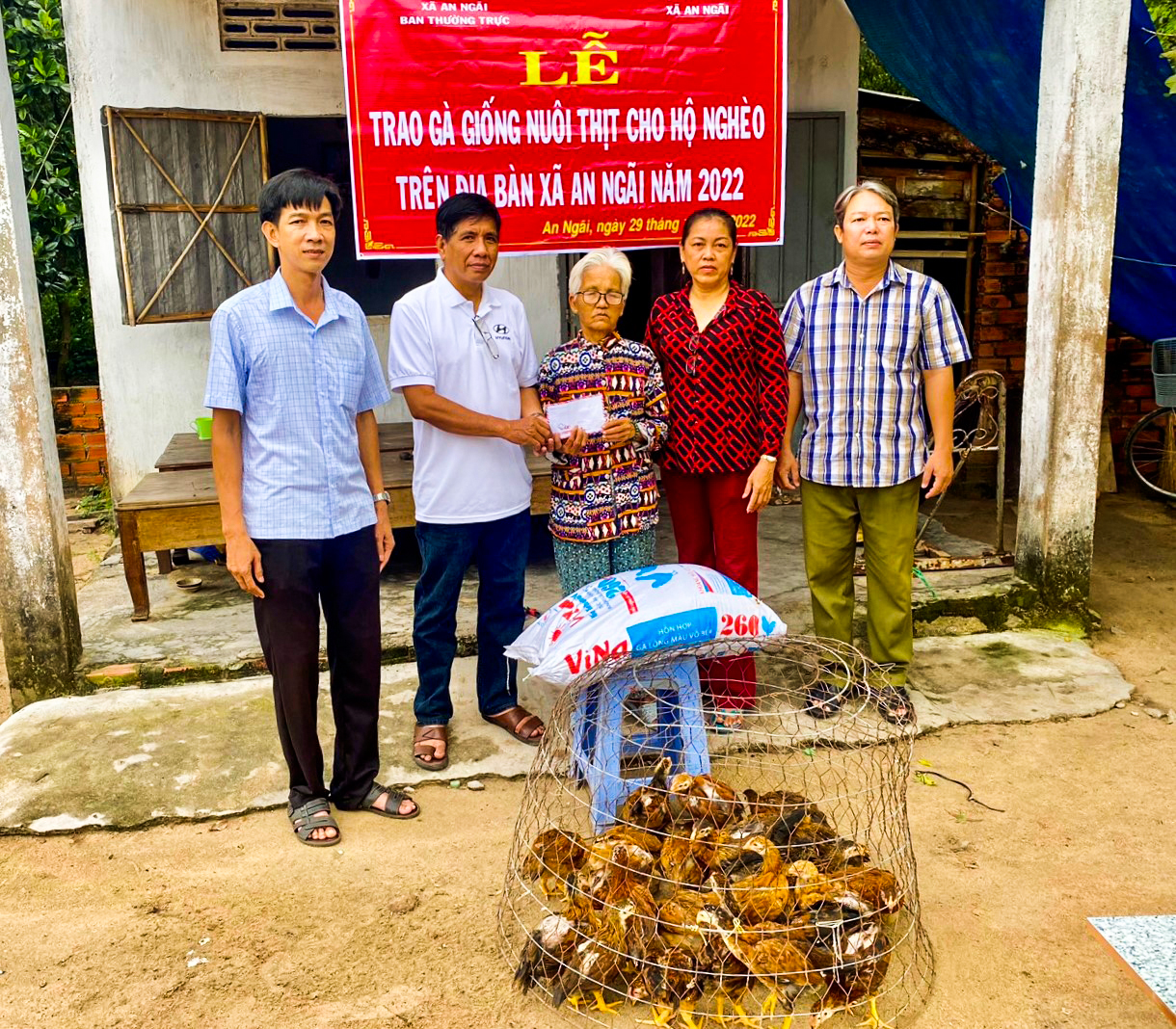 | Đại diện UBND, hội, đoàn thể xã An Ngãi trao gà giống cho bà Nguyễn Thị Sáu (ấp An Phước), hộ nghèo trên địa bàn. |