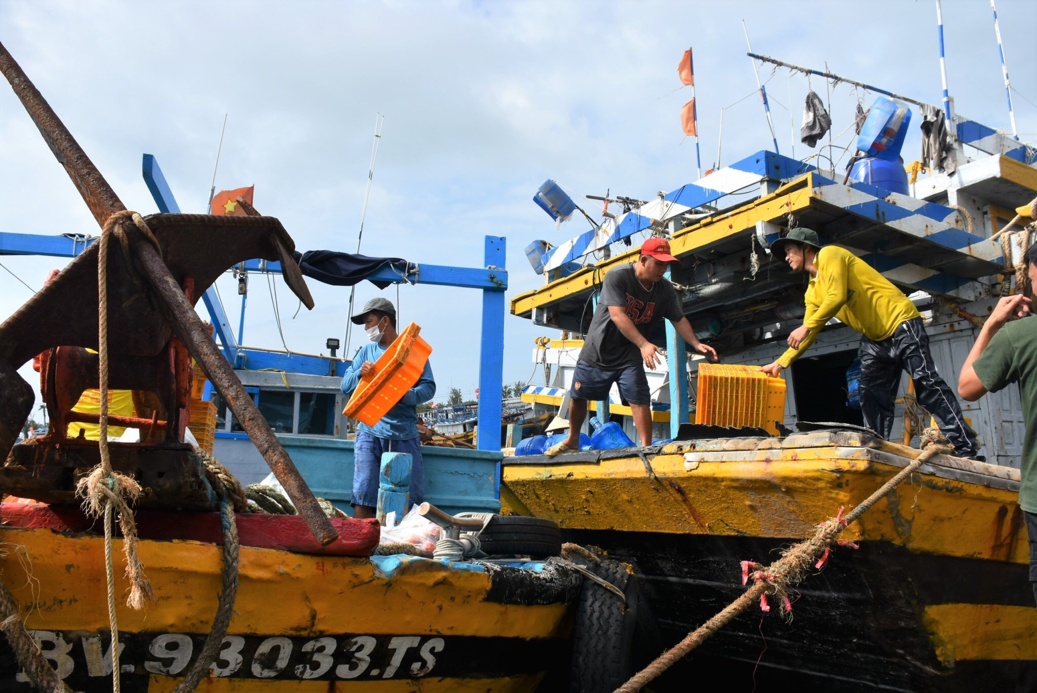 | Tàu cá của ngư dân xã Lộc An, huyện Đất Đỏ chuẩn bị ngư lưới cụ cho chuyến ra khơi. |