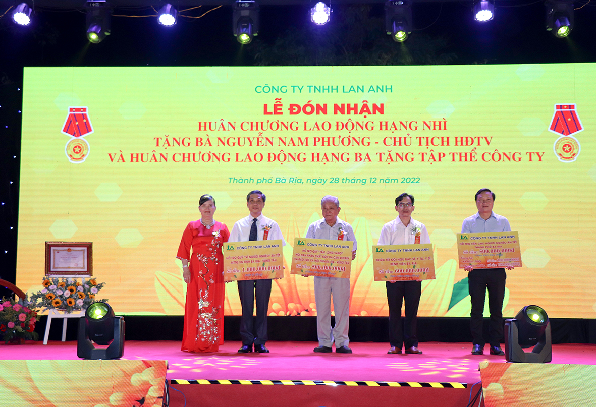 Chiều 28/12, Công ty TNHH Lan Anh (TP.Bà Rịa) tổ chức Lễ đón nhận Huân chương Lao động. Bà Nguyễn Thị Yến, Phó Bí thư Thường trực Tỉnh ủy, Trưởng Đoàn ĐBQH tỉnh; ông Nguyễn Công Vinh, Phó Chủ tịch UBND tỉnh đến dự.