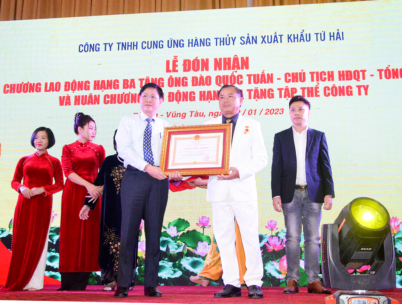 Chiều 12/1, Công ty TNHH Cung ứng hàng Thủy sản Xuất khẩu Tứ Hải (gọi tắt là Công ty TNHH Tứ Hải) tổ chức lễ kỷ niệm 30 năm thành lập và đón nhận Huân chương Lao động hạng Ba cho tập thể công ty và cá nhân ông Đào Quốc Tuấn, Chủ tịch HĐQT, Tổng Giám đốc công ty. Ông Lê Ngọc Khánh, Phó Chủ tịch UBND tỉnh đến dự lễ kỷ niệm.