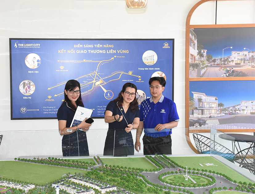 | Dự án The Light City do Hodeco được xây dựng với hướng xanh, thông minh, bền vững, tiện ích khép kín. Trong ảnh: Lãnh đạo Hodeco giới thiệu với khách hàng về mô hình dự án The Light City. |