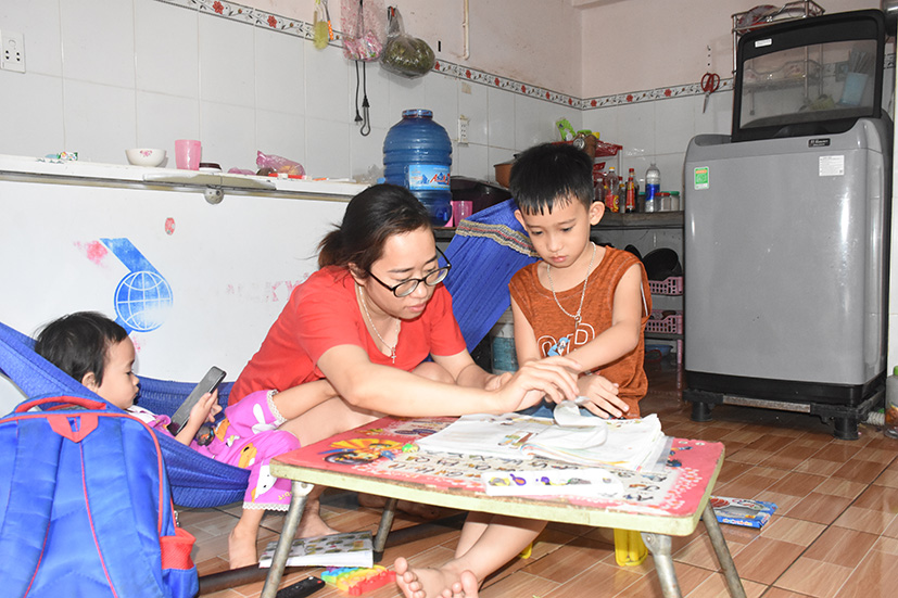 | Chị Chu Thị Ngọc và các con trong căn phòng trọ tại khu phố Tân Hạnh, phường Phú Mỹ, TX. Phú Mỹ. |
