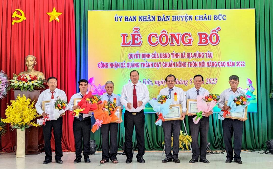 Tại buổi lễ, UBND huyện Châu Đức tặng Giấy khen cho 3 tập thể, 6 cá nhân có thành tích xuất sắc trong công tác xây dựng xã Quảng Thành đạt chuẩn xã NTM nâng cao năm 2022.