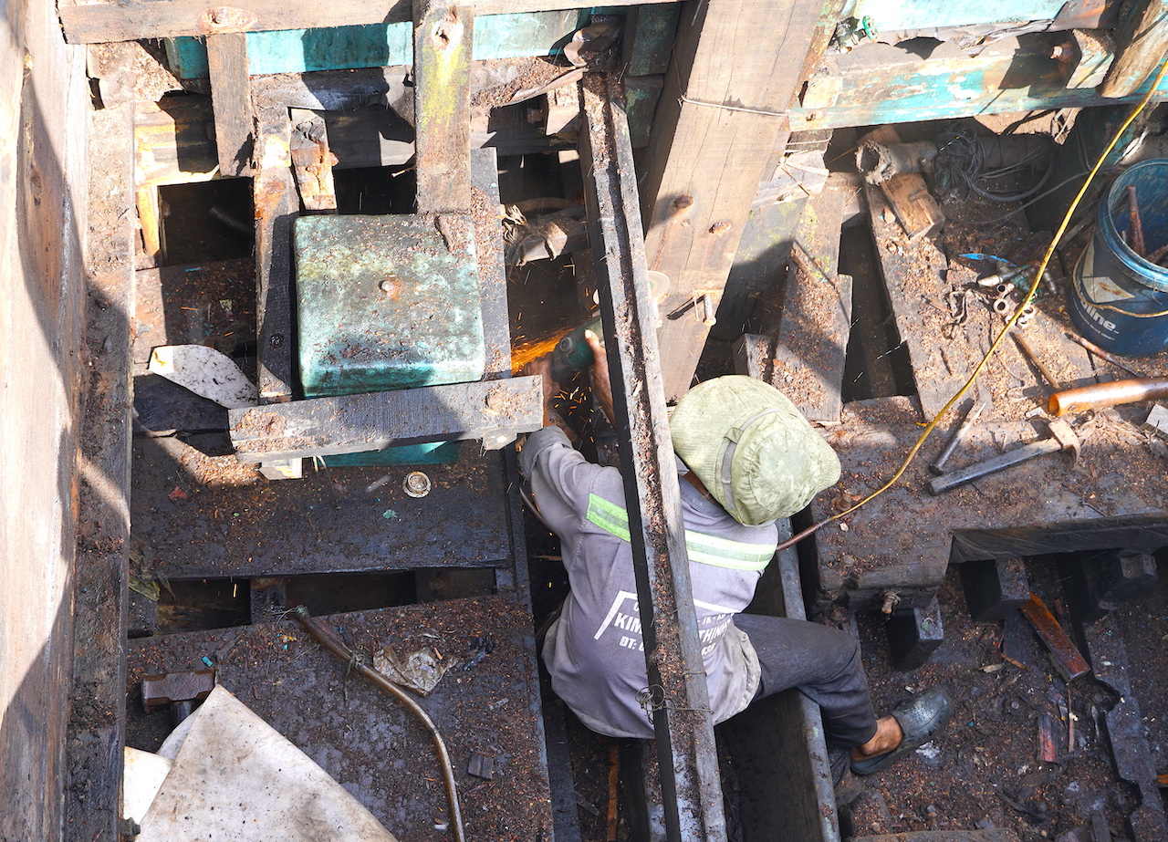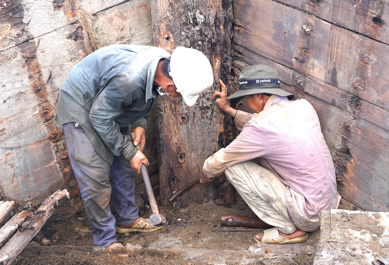 | Những người thợ phải luồn lách trong các ô, hầm cá của tàu dùng máy cắt, máy khoan để cắt đinh, bulong nối các cột gỗ lớn trong thân tàu. |