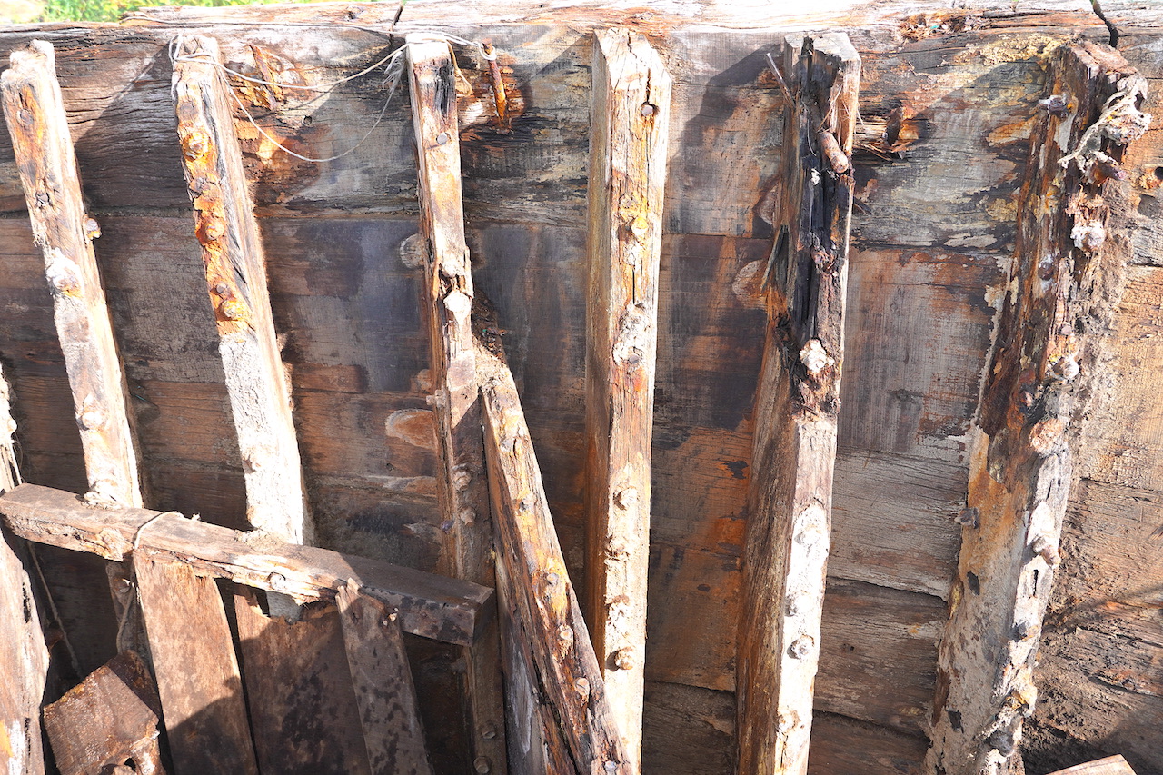 | Tàu giã cào rã xác bán bán phế liệu chủ yếu bị hư hỏng máy móc và một số bộ phận nhỏ. Phần gỗ vỏ còn mới và khung "xương" khá vững chắc. |