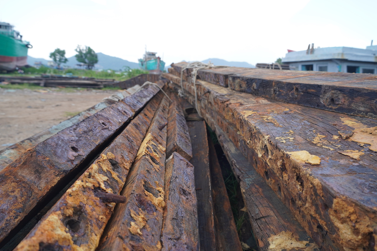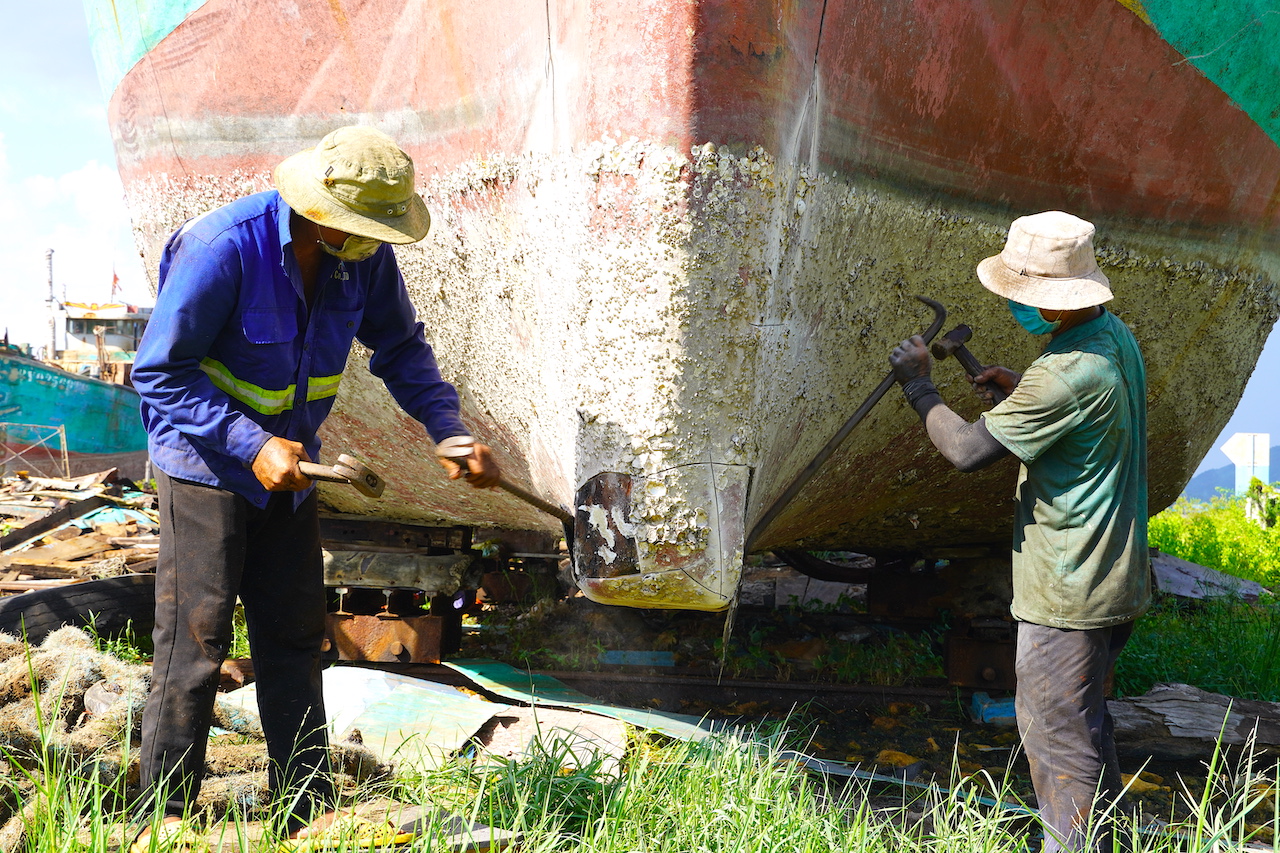 | Ngày đầu tháng 8, ụ tàu Tân Bền, ấp Phước Thái, xã Phước Tỉnh, huyện Long Điền vang dội tiếng máy cắt, tiếng búa chát chúa của hai nhóm thợ “xẻ thịt” tàu cá. Trên ụ, hai tàu giã cào công suất 180CV/tàu được những người thợ tất bật phá dỡ để lấy gỗ. Những bộ phận như: máy móc, chân vịt, cây lap... đã được tháo dỡ và bán trước khi thợ tiến hành rã xác tàu. |