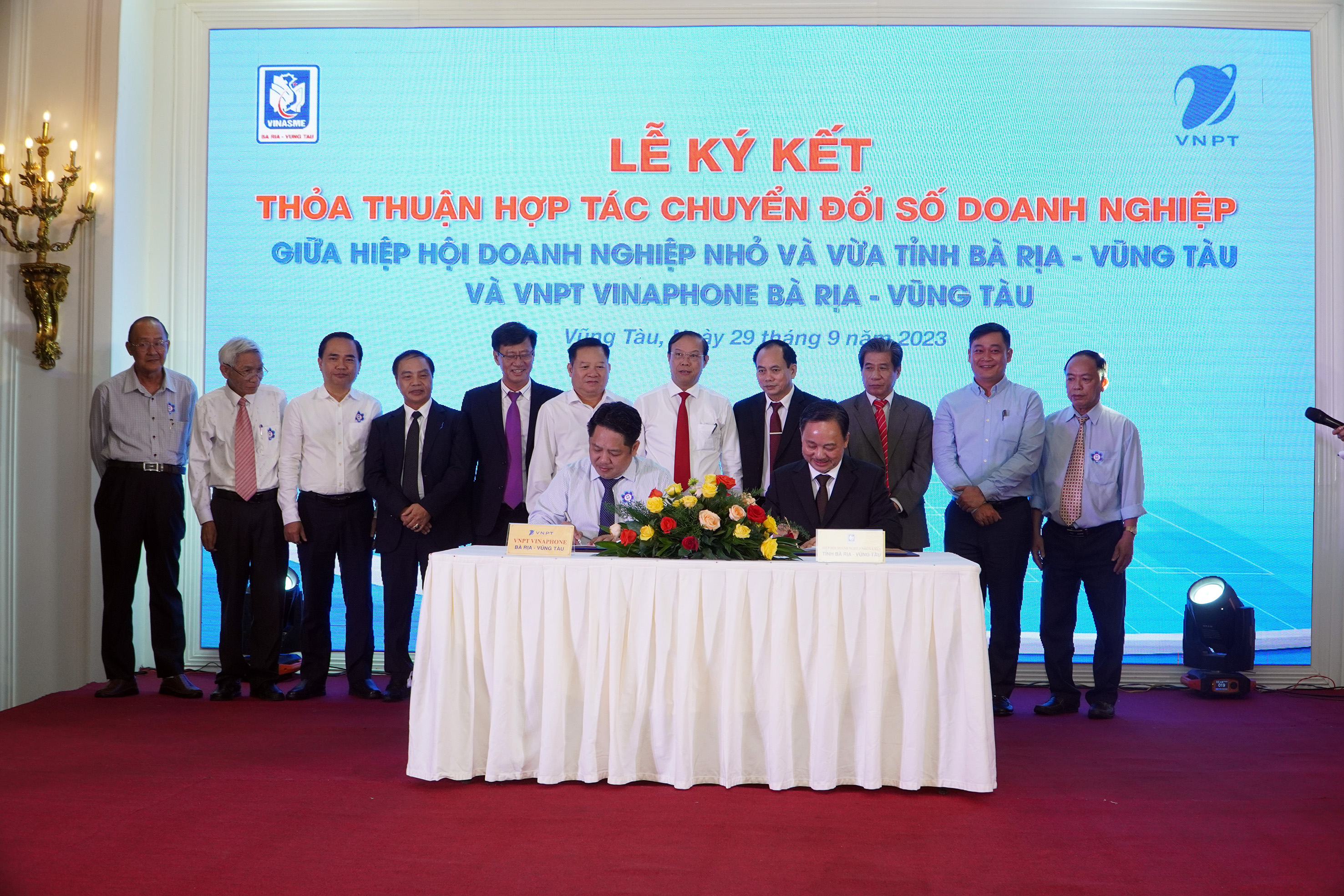 | Chủ tịch UBND tỉnh Nguyễn Văn Thọ và lãnh đạo tỉnh chứng kiến Hiệp hội DNNVV tỉnh ký kết hợp tác chuyển đổi số với VNPT Bà Rịa-Vũng Tàu. |