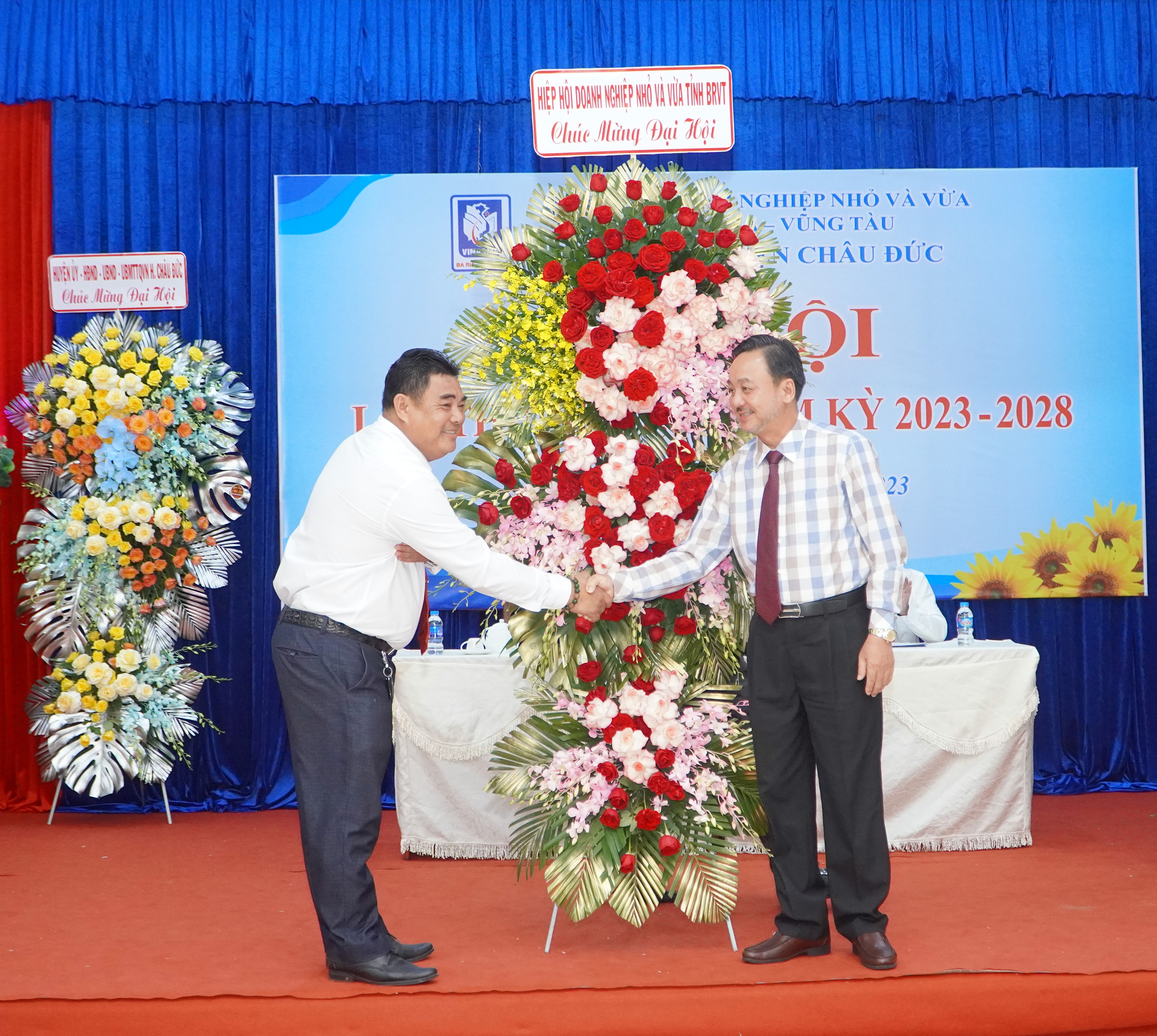 | Lãnh đạo Hiệp hội DNNVV tỉnh, huyện Châu Đức tặng hoa chúc mừng BCH Chi hội DNNVV huyện Châu Đức. |
