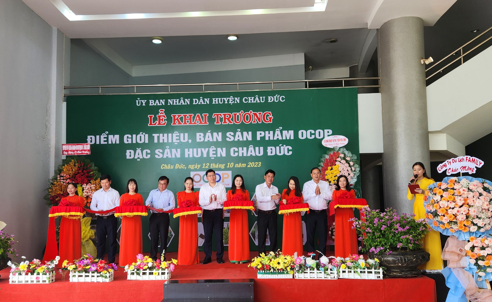 | Đại diện lãnh đạo Sở NN-PTNT và lãnh đạo Huyện ủy, UBND huyện Châu Đức cắt băng khai trương điểm điểm trưng bày, giới thiệu và bán sản phẩm OCOP huyện Châu Đức. |