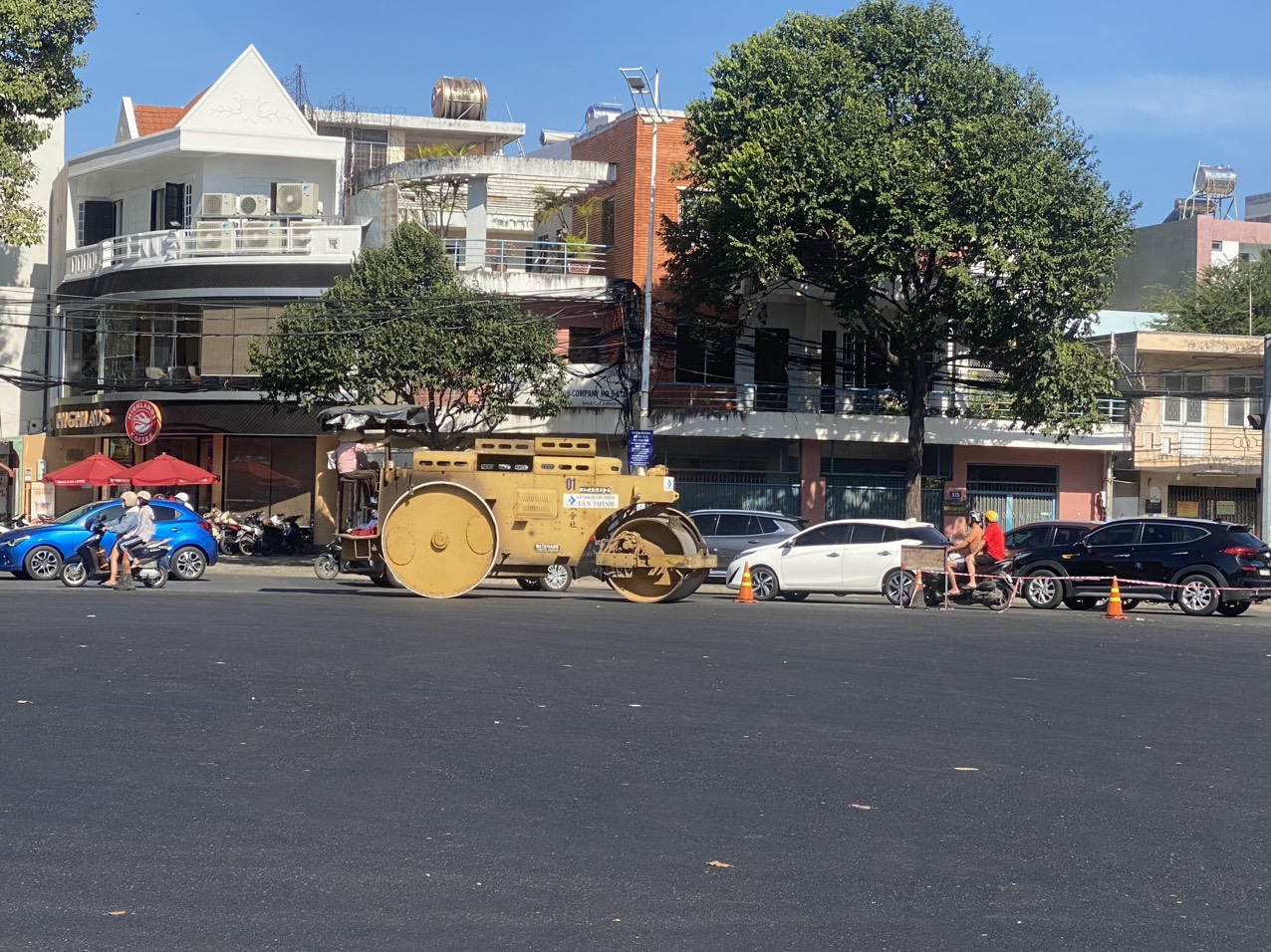 | Đơn vị thi công đang lu nền đường sau khi di dời thành công Tượng đài Dầu khí |