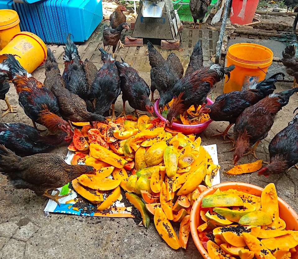 | Nhờ tận dụng các phụ phẩm nông nghiệp dư thừa tại địa phương như chuối, đu đủ, bầu, bí… nên chi phí thức ăn cho trại gà được cắt giảm đáng kể. |