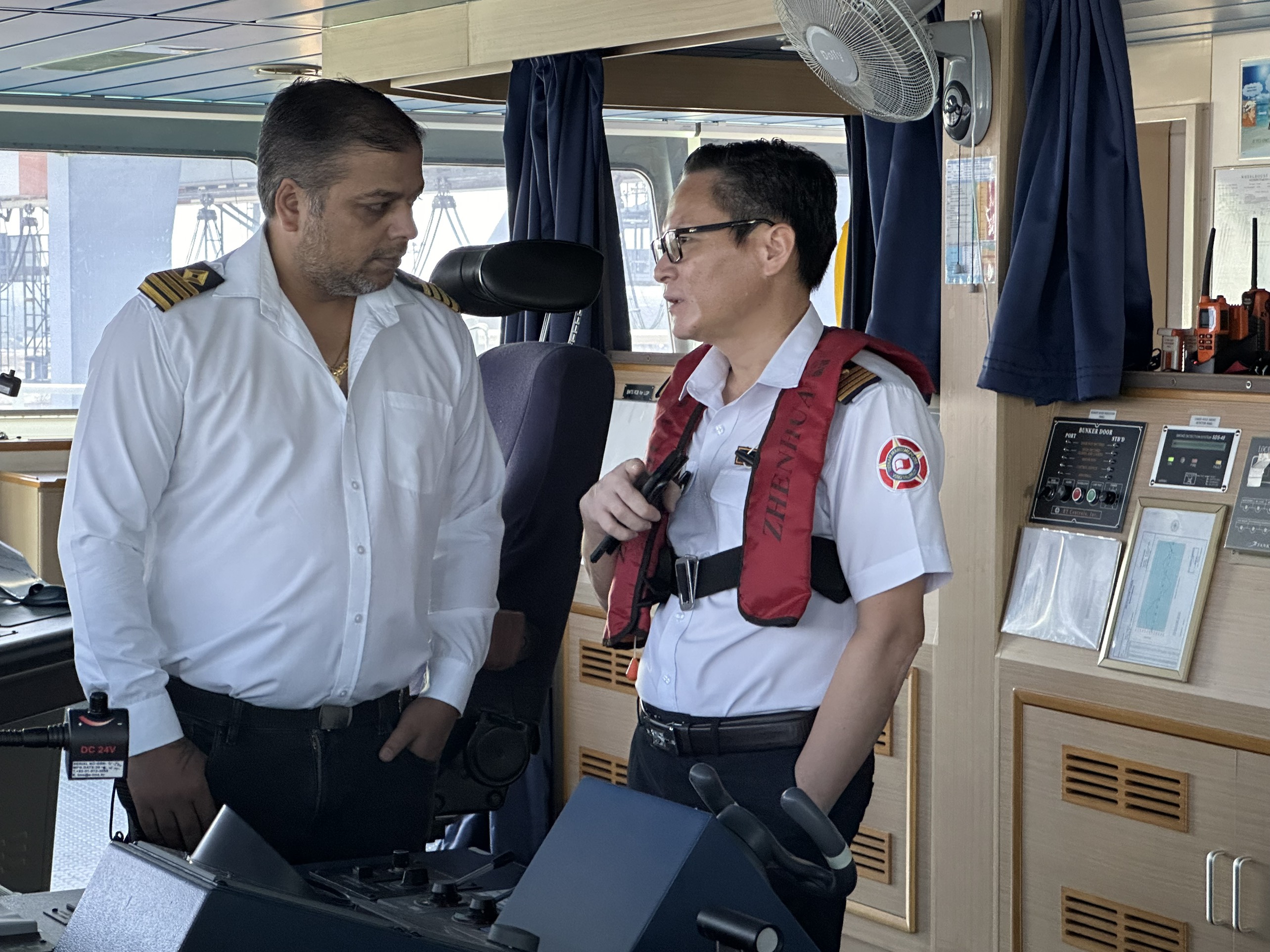 | Hoa tiêu ngoại hạng Vũ Ngọc An trao đổi trao đổi, bàn bạc với thuyền trưởng Sundeep Dhanker thông tin về độ sâu, độ rộng luồng, thủy triều, tốc độ tàu, mớn nước trước khi rời cảng. |