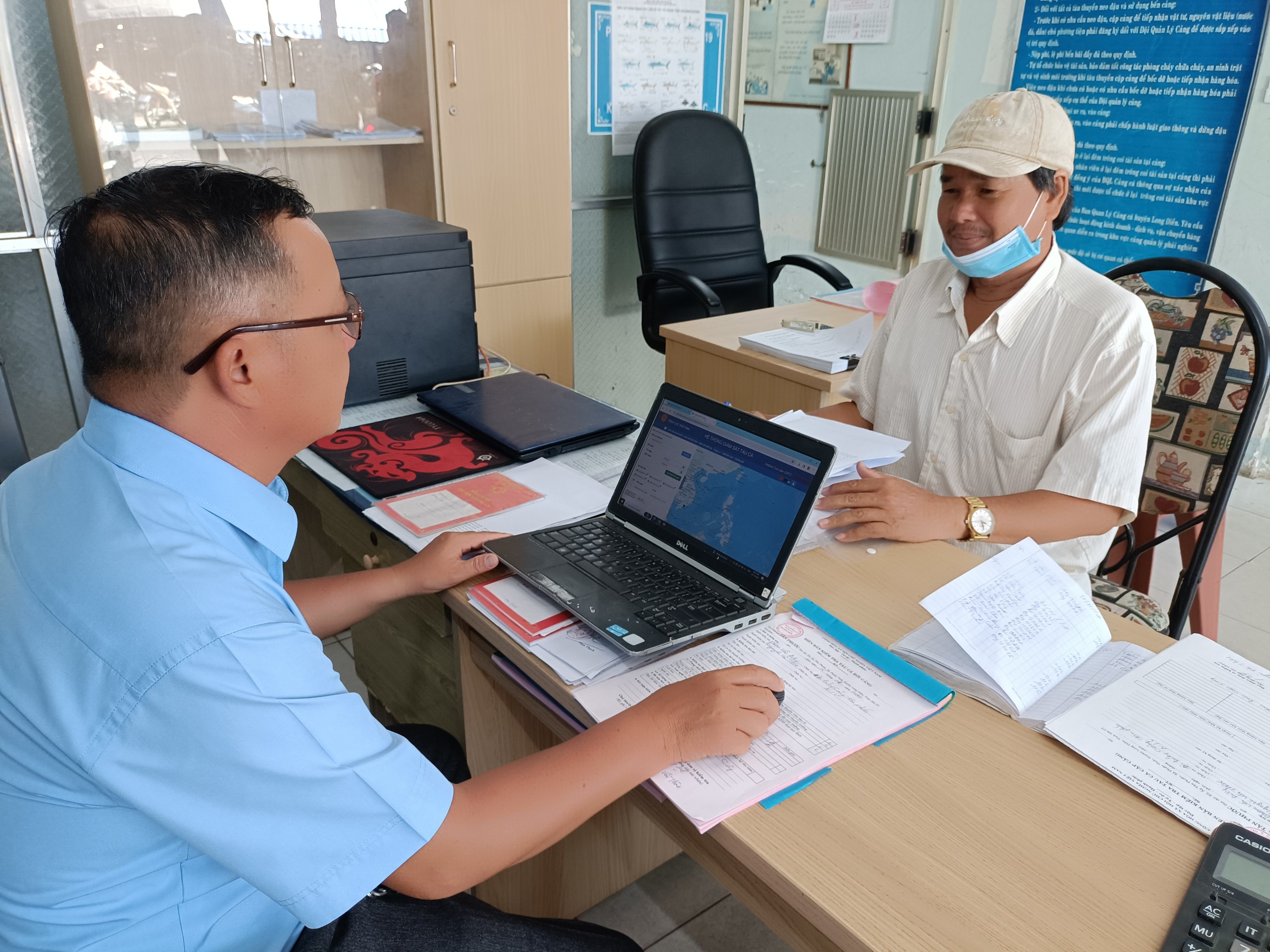 | Nhân viên cảng cá Tân Phước (huyện Long Điền) kiếm tra giấy tờ, tọa độ, sản lượng hải sản khai thác theo nhật ký hành trình tàu cá khai báo. |