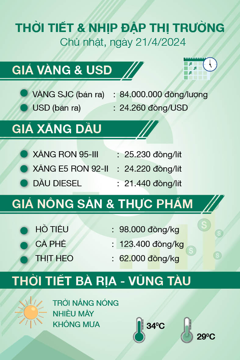 Cập nhật giá vàng, USD, xăng, một số mặt hàng lương thực, thực phẩm, nông sản và thời tiết hôm nay (21/4).