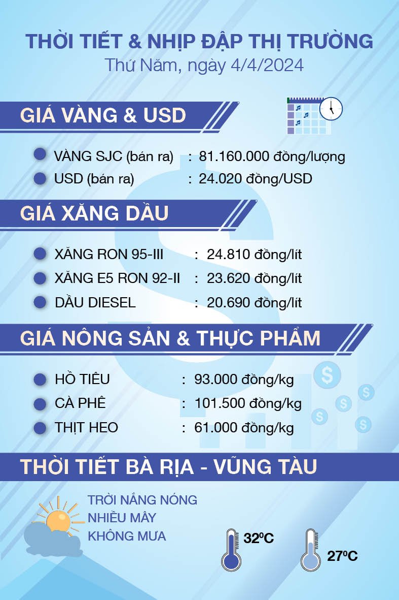 Cập nhật giá vàng, USD, xăng, một số mặt hàng lương thực, thực phẩm, nông sản và thời tiết hôm nay (4/4).