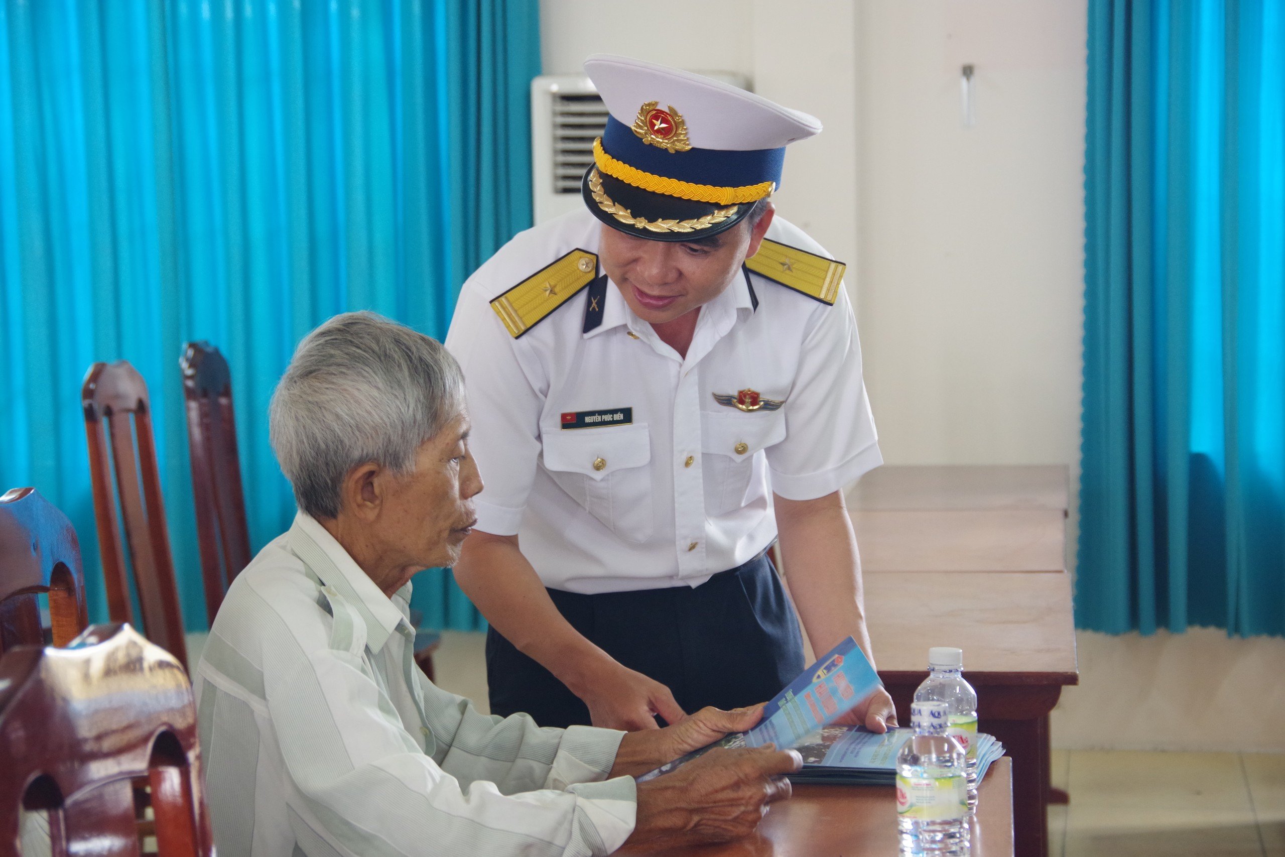 | Cán bộ Lữ đoàn 171 (Vùng 2 Hải quân) phát tờ rơi tuyên truyền đánh bắt thủy, hải sản an toàn đến người dân. |