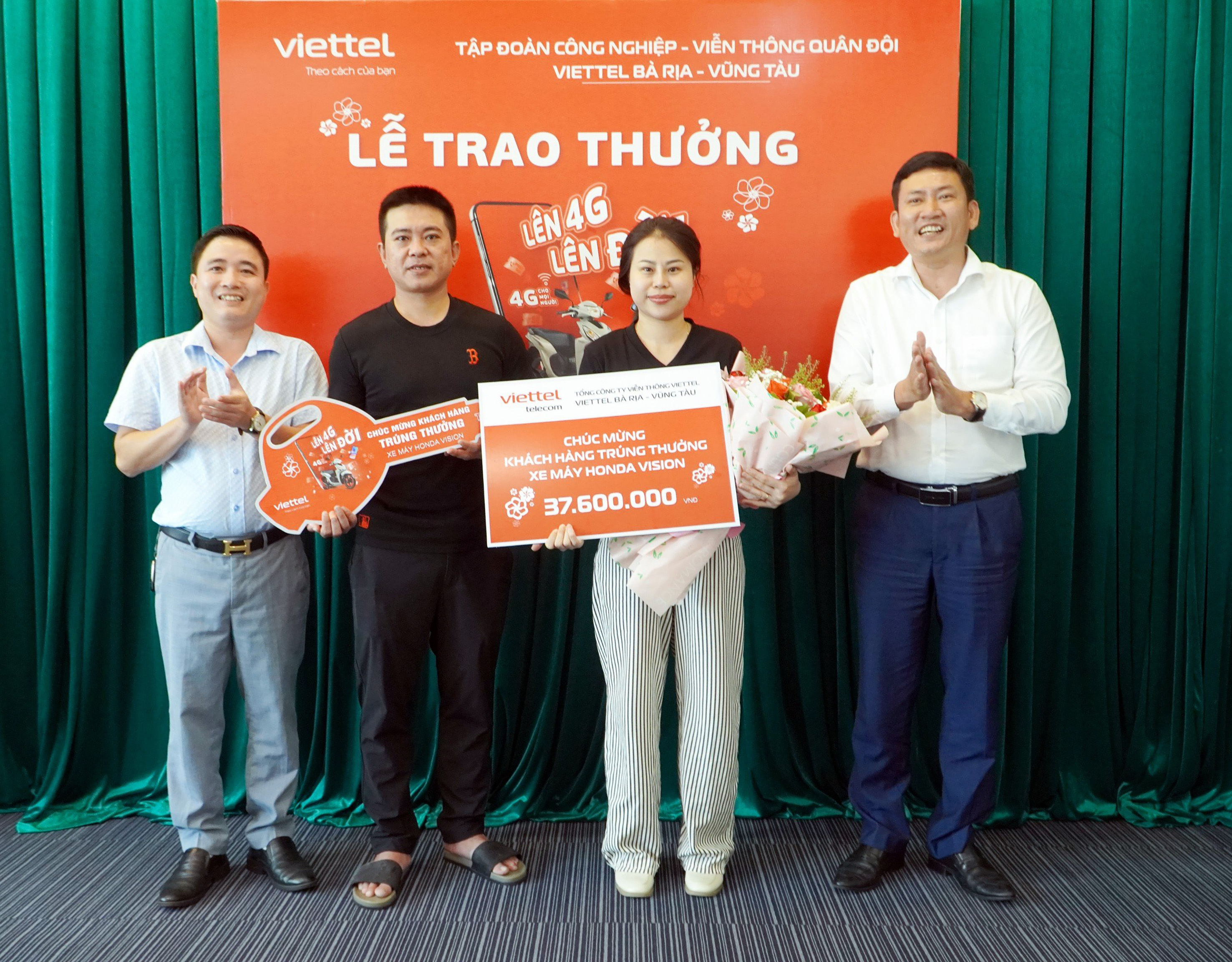 Sáng 25/04, Viettel Bà Rịa-Vũng Tàu trao giải thưởng xe máy Vision trị giá 37,6 triệu đồng của chương trình “lên 4G - lên đời” cho khách hàng may mắn trúng thưởng, đó là chị Nguyễn Thị Thu Thảo (phường Phước Nguyên, TP. Bà Rịa).