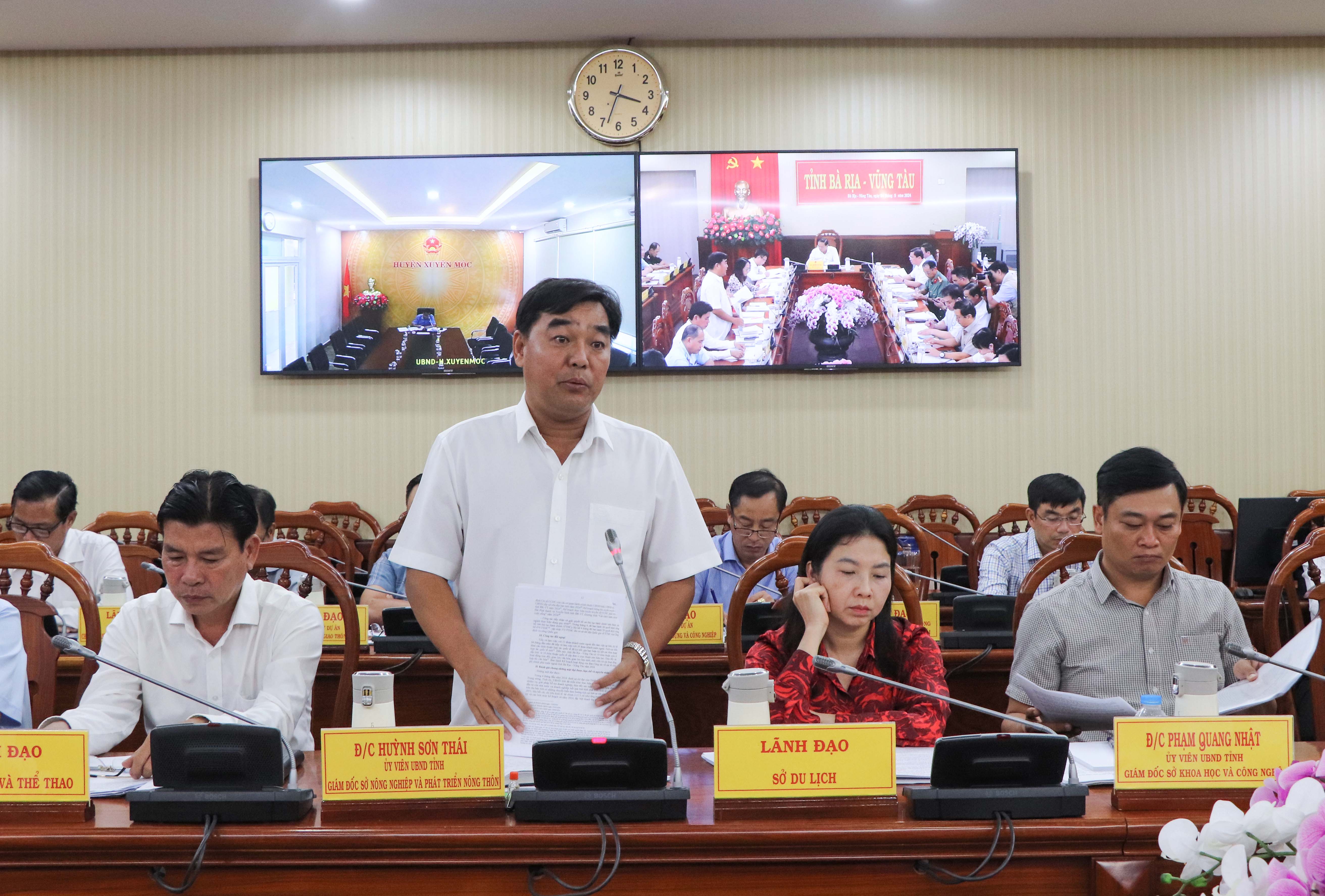 | Giám đốc Sở NN-PTNT Huỳnh Sơn Thái phát biểu một số ý kiến về các công trình cung cấp nước sinh hoạt, nước sản xuất trên địa bàn tỉnh. |