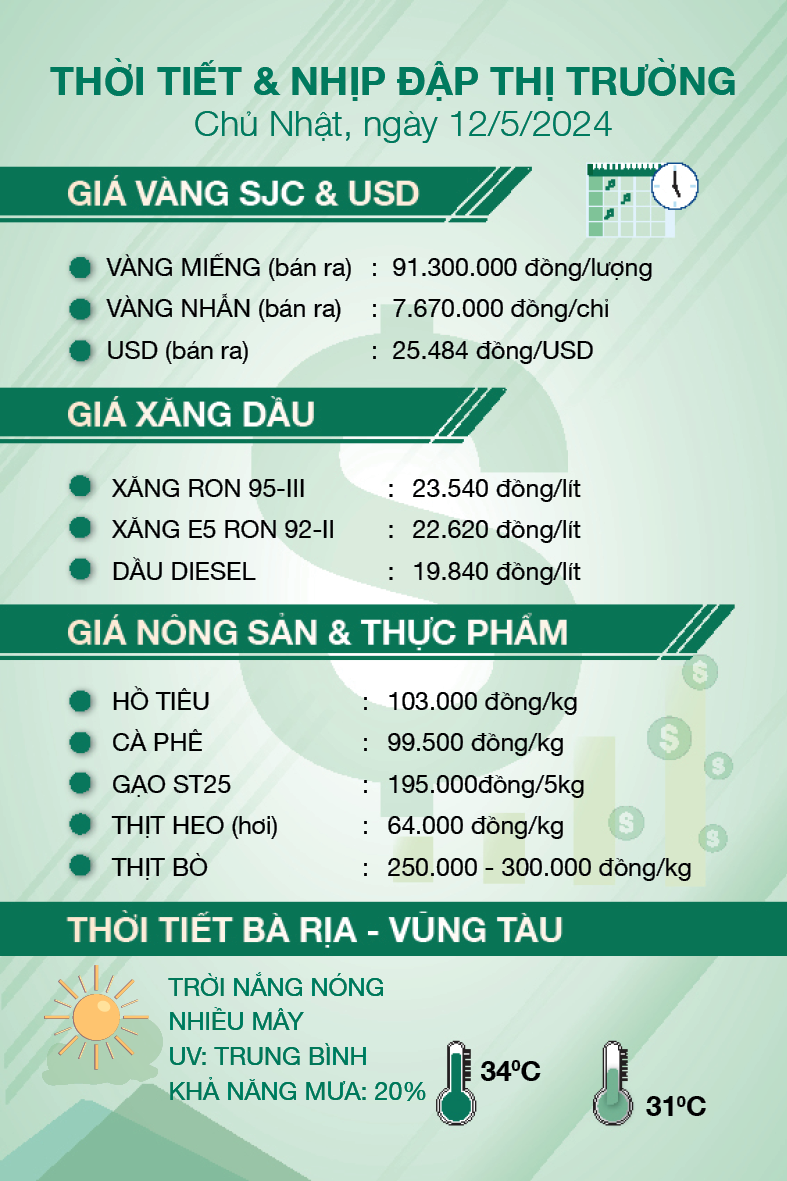 Cập nhật giá vàng, USD, xăng, một số mặt hàng lương thực, thực phẩm, nông sản và thời tiết hôm nay (12/5).