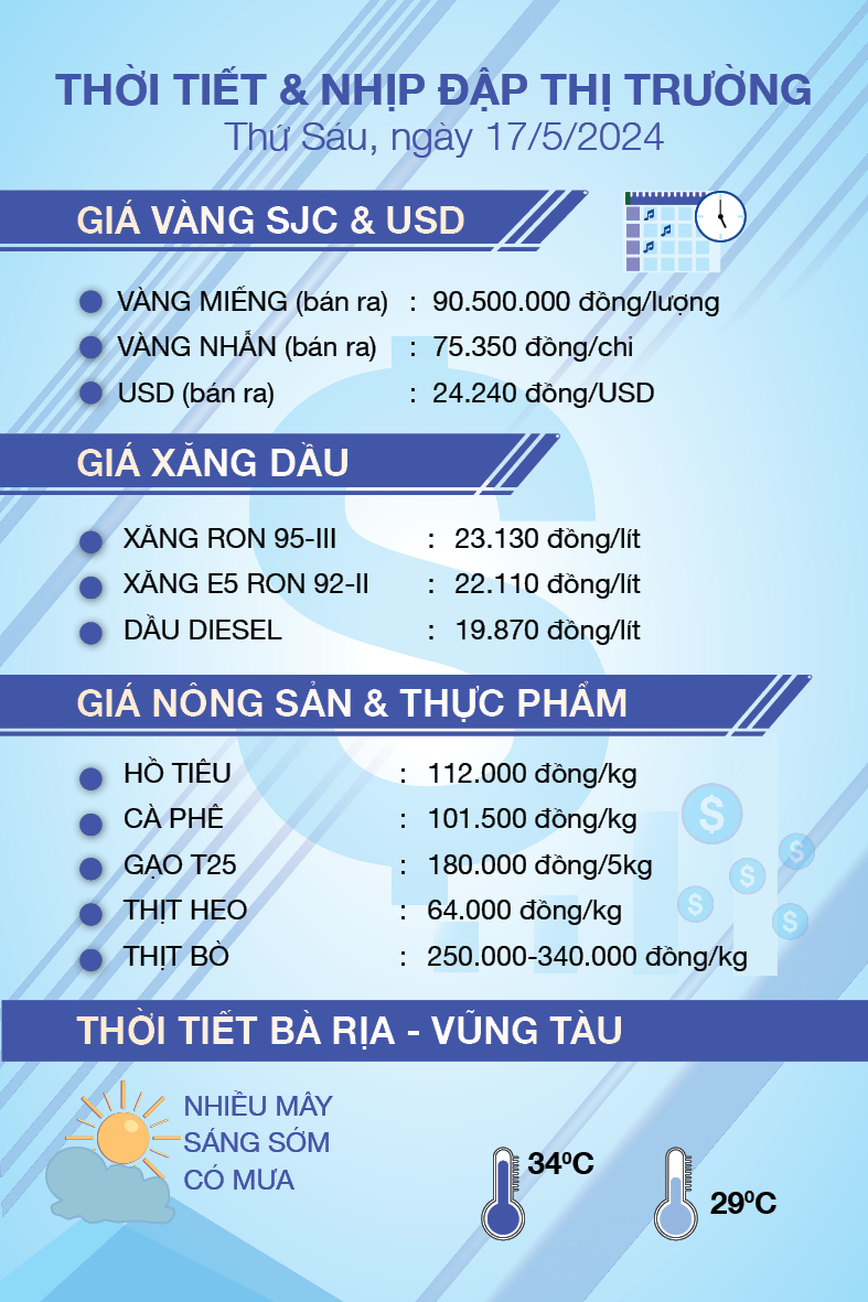 Cập nhật giá vàng, USD, xăng, một số mặt hàng lương thực, thực phẩm, nông sản và thời tiết hôm nay (17/5)