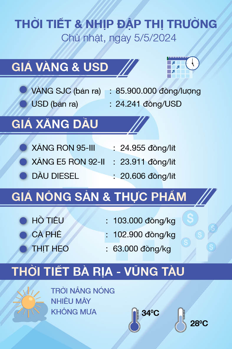 Cập nhật giá vàng, USD, xăng, một số mặt hàng lương thực, thực phẩm, nông sản và thời tiết hôm nay (5/5).