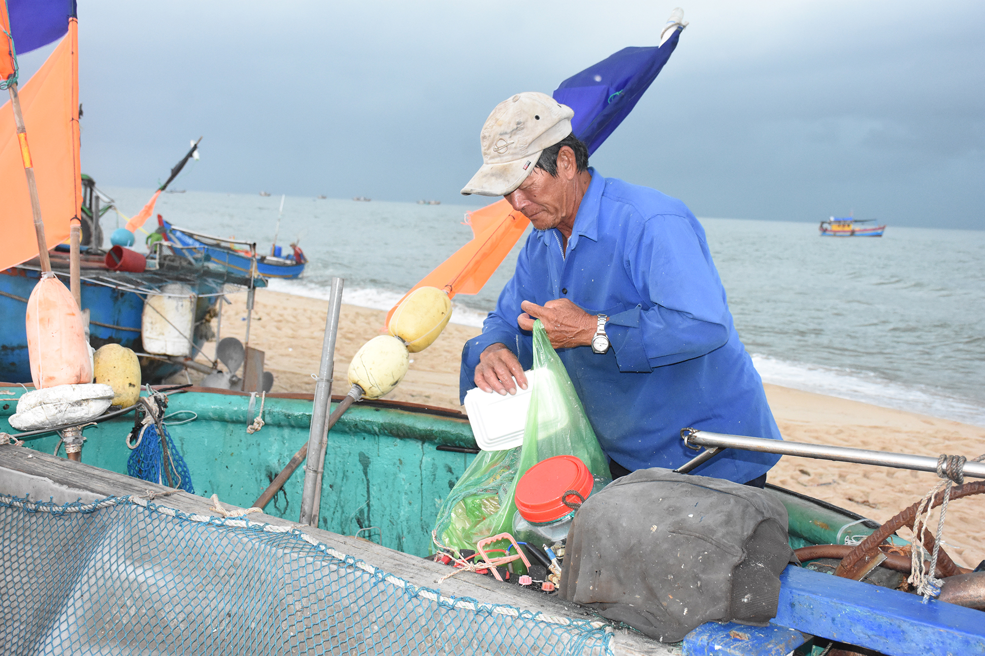 Chiếc thuyền thúng cập bến, ngư dân Lê Hữu Đức gom hết chai nhựa, túi ni-lông, hộp xốp từ thuyền cho vào túi rồi mang lên bờ. “Từ 2-3 năm nay, mỗi lần ra khơi, tui đều mang rác vào bờ để bảo vệ môi trường biển chứ không xả xuống biển như trước nữa”, ông Đức cho hay.