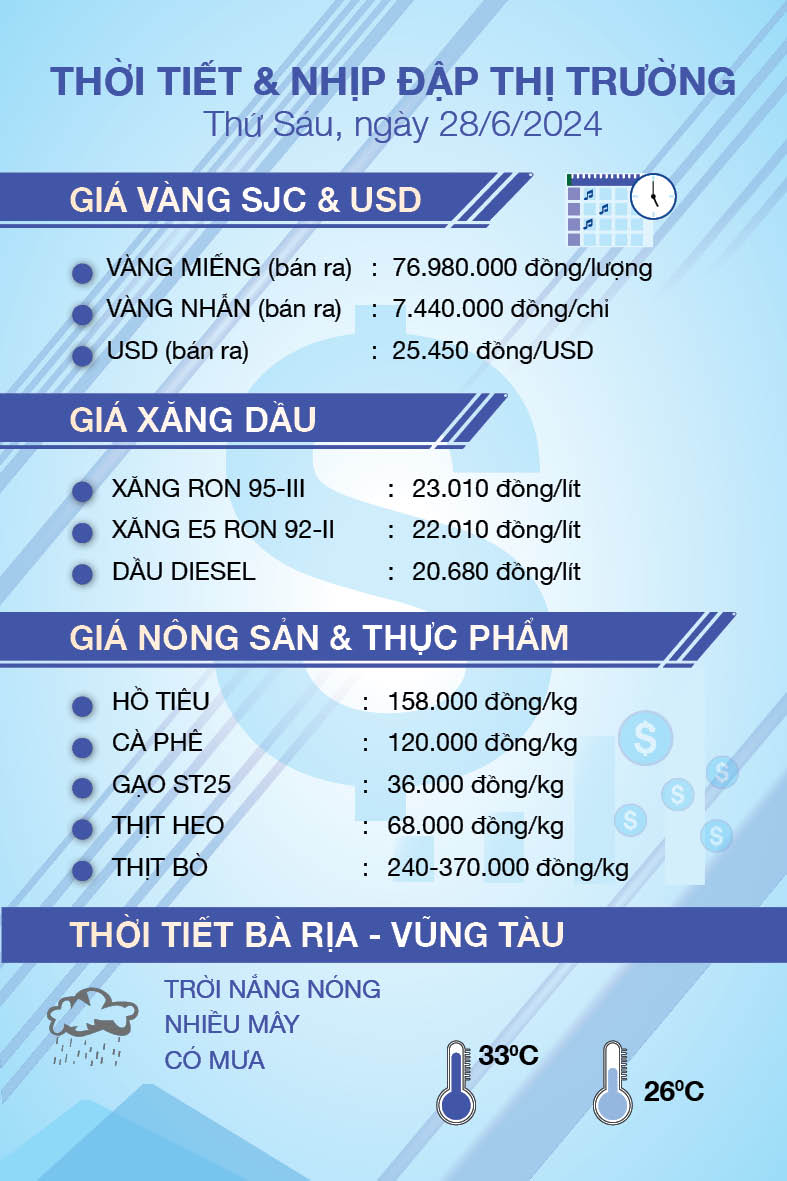 Cập nhật giá vàng, USD, xăng, một số mặt hàng lương thực, thực phẩm, nông sản và thời tiết hôm nay (28/6).