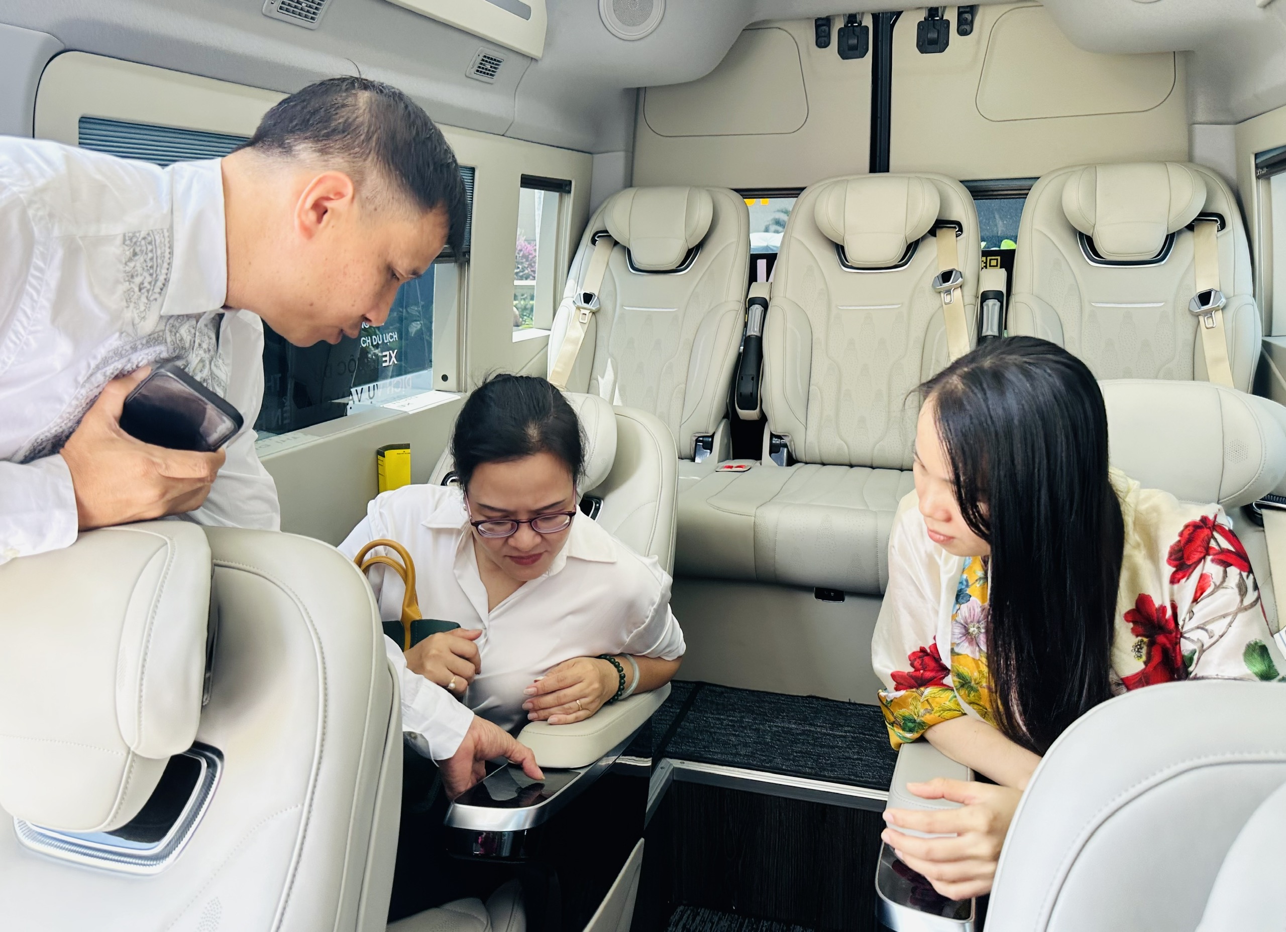 | Ông Trịnh Thắng, Tổng Giám đốc Công ty Liên doanh vận chuyển Quốc tế Hải Vân hướng dẫn các tính năng, chế độ thư giãn của xe. |