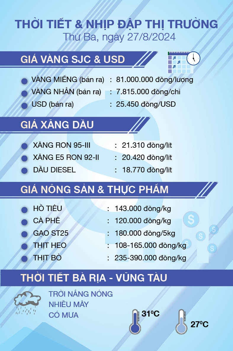 Cập nhật giá vàng, USD, xăng, một số mặt hàng lương thực, thực phẩm, nông sản và thời tiết hôm nay (27/8).