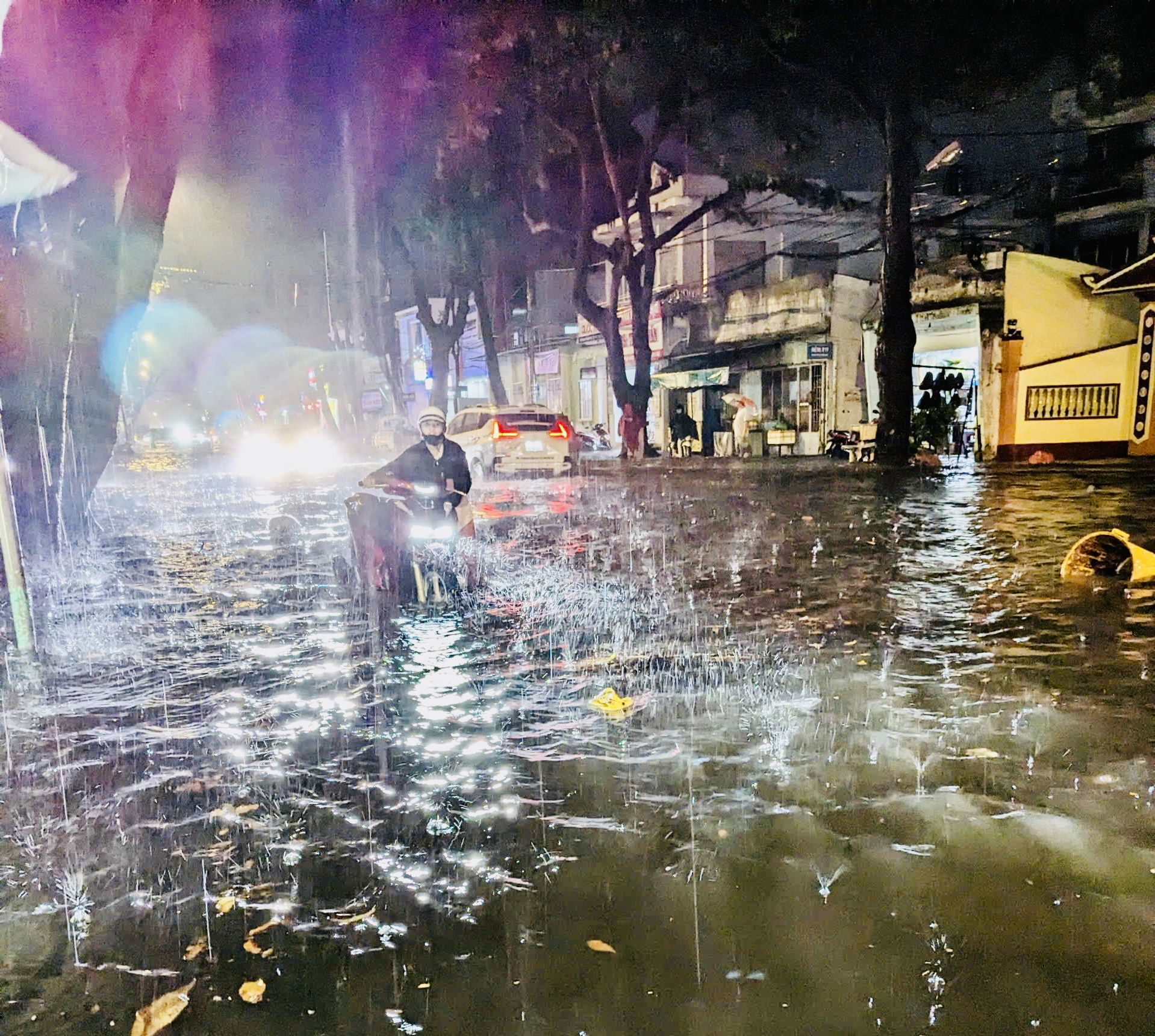 | Mưa to khiến tuyến đường Phạm Hồng Thái ngập sâu, xe của người dân bị chết máy phải dắt bộ. Ảnh: Toàn Phạm |