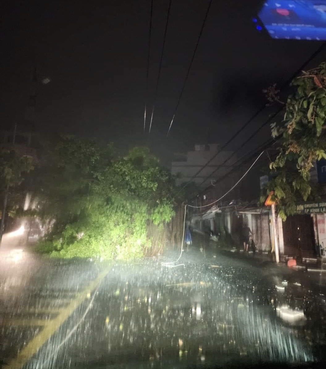 | Cây xanh trên đường Trần Phú gãy đổ đè lên đường dây điện. Ảnh: TP |