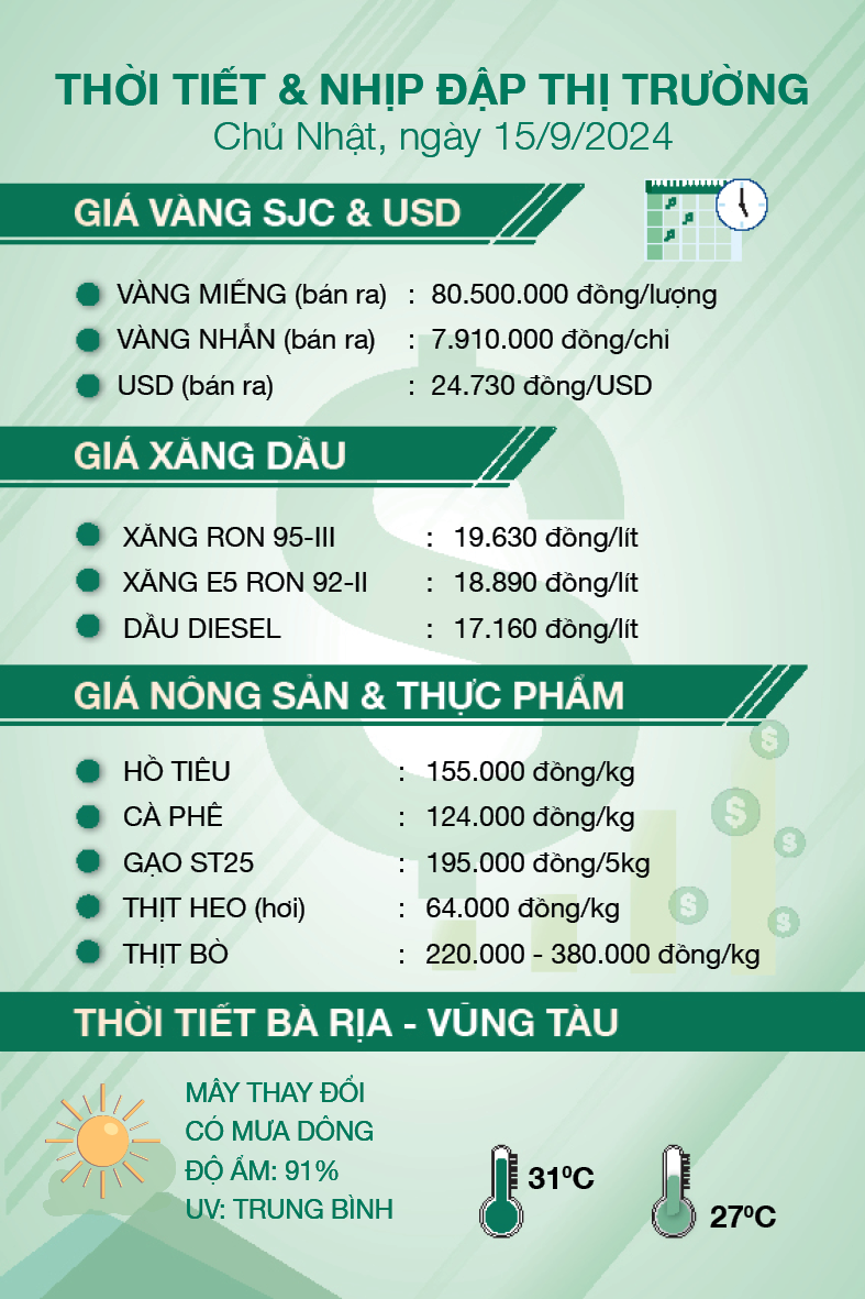 Cập nhật giá vàng, USD, xăng, một số mặt hàng lương thực, thực phẩm, nông sản và thời tiết hôm nay (15/9).