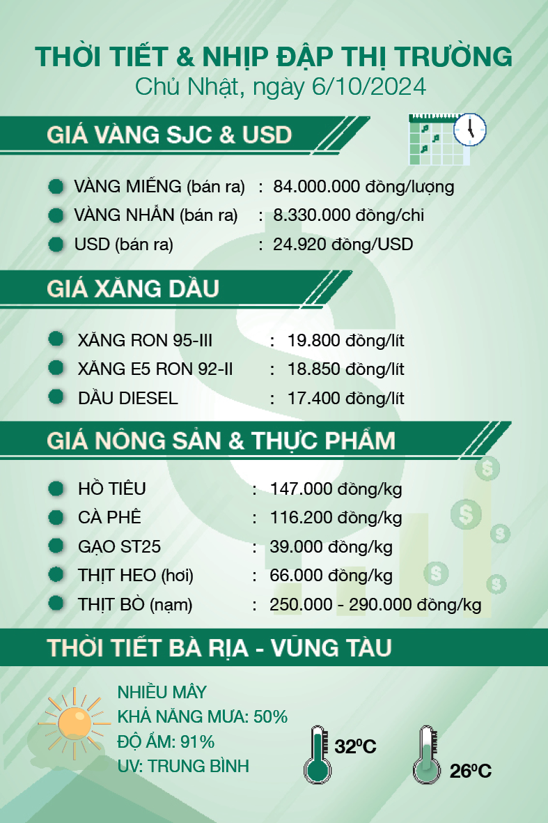 Cập nhật giá vàng, USD, xăng, một số mặt hàng lương thực, thực phẩm, nông sản và thời tiết hôm nay (6/10).