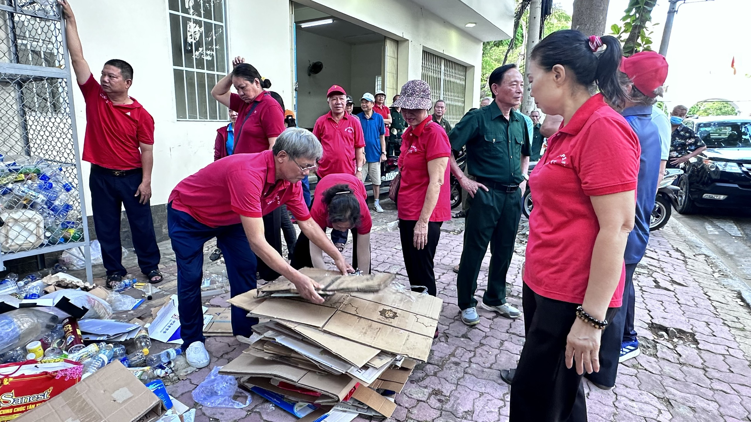 Sáng Chủ nhật, khu chung cư 5 tầng khu phố 9 (phường 7, TP.Vũng Tàu) trở nên rộn ràng hơn bởi hoạt động PLRTN. Gần 20 chị em phụ nữ tập trung phía dưới sân. Người phân loại nhựa, giấy, bìa…, người bỏ vào bao tải, người thì đưa lên cân. Sau khi phân loại, đã có hơn 40kg bìa các tông, gần 400 vỏ lon bia và hơn 20kg sắt vụn được bán cho điểm thu mua ve chai.