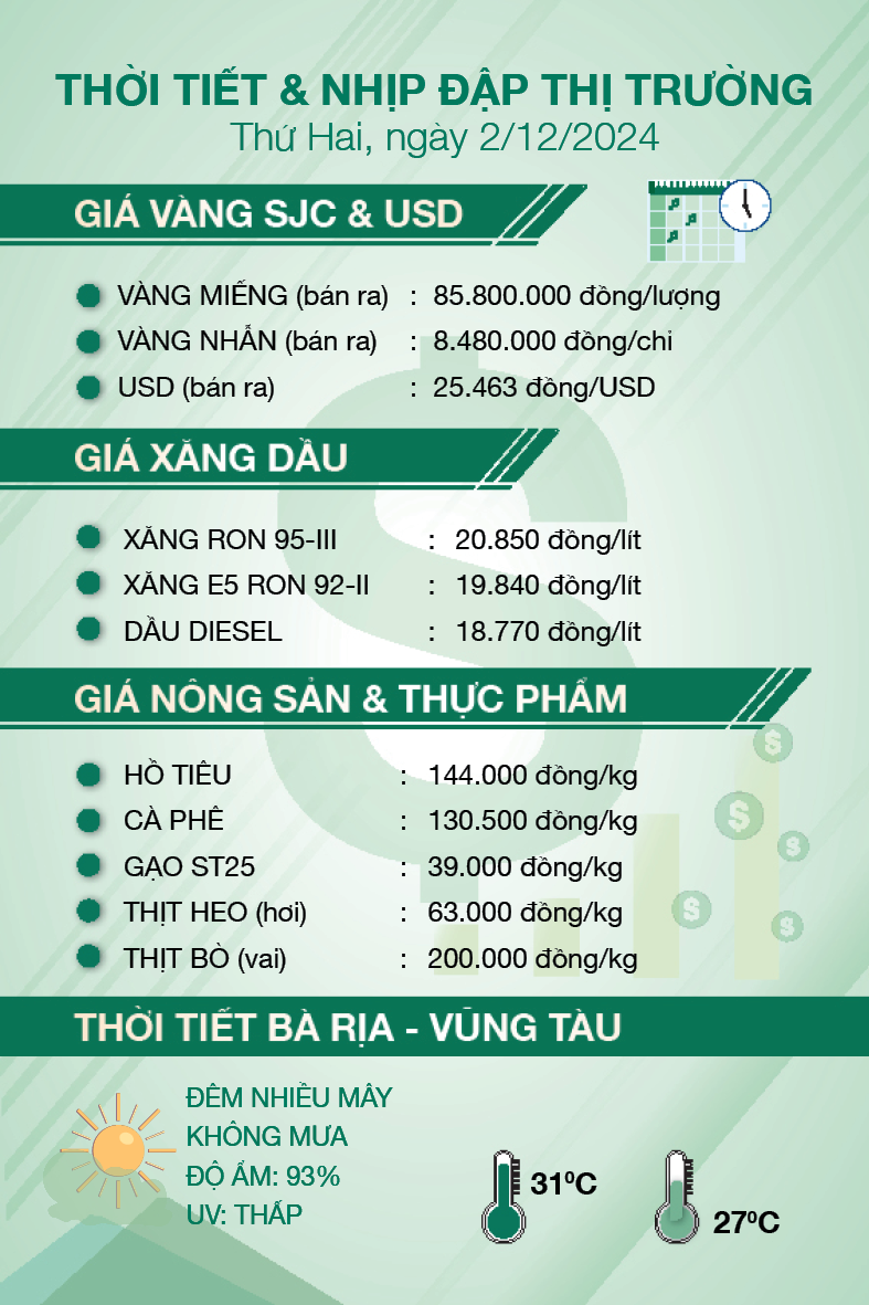 Cập nhật giá vàng, USD, xăng, một số mặt hàng lương thực, thực phẩm, nông sản và thời tiết hôm nay (2/12).