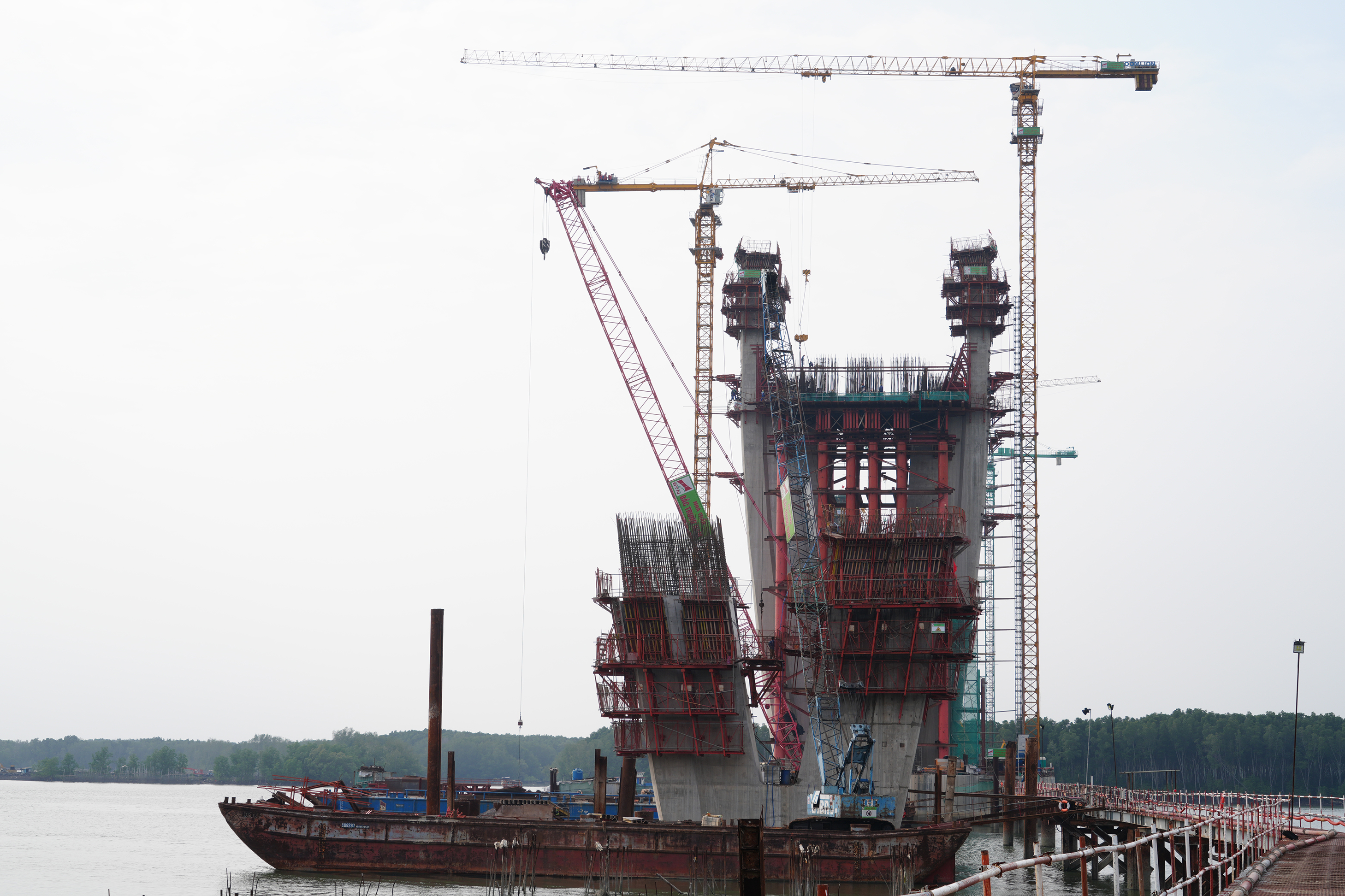 | Các trụ cầu Phước An dần vươn cao giữa dòng sông Thị Vải. |
