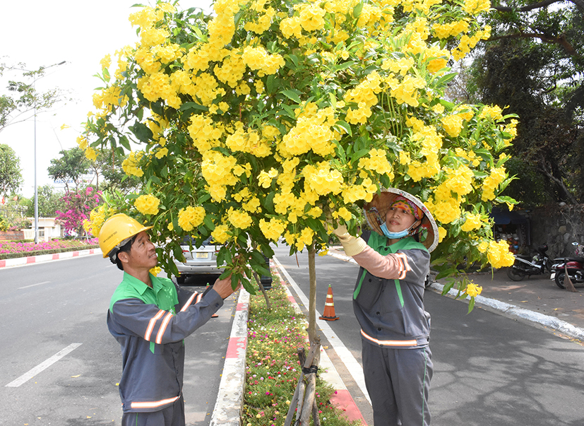 | Công nhân UPC chăm sóc cây hoa dọc dải phân cách đường 3/2, TP.Vũng Tàu. |
