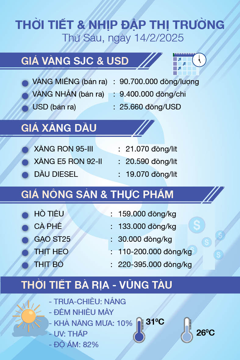 Cập nhật giá vàng, USD, xăng, một số mặt hàng lương thực, thực phẩm, nông sản và thời tiết hôm nay (14/2).