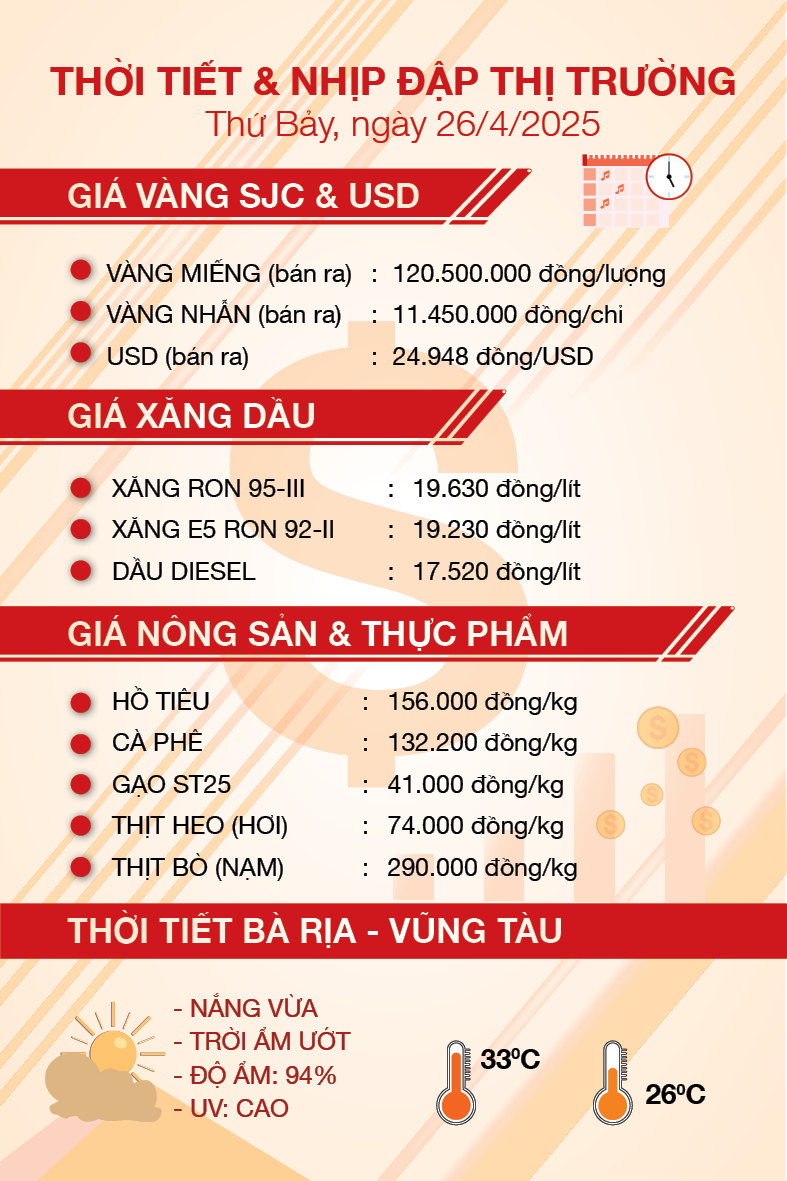 Cập nhật giá vàng, USD, xăng, một số mặt hàng lương thực, thực phẩm, nông sản và thời tiết hôm nay (26/4)