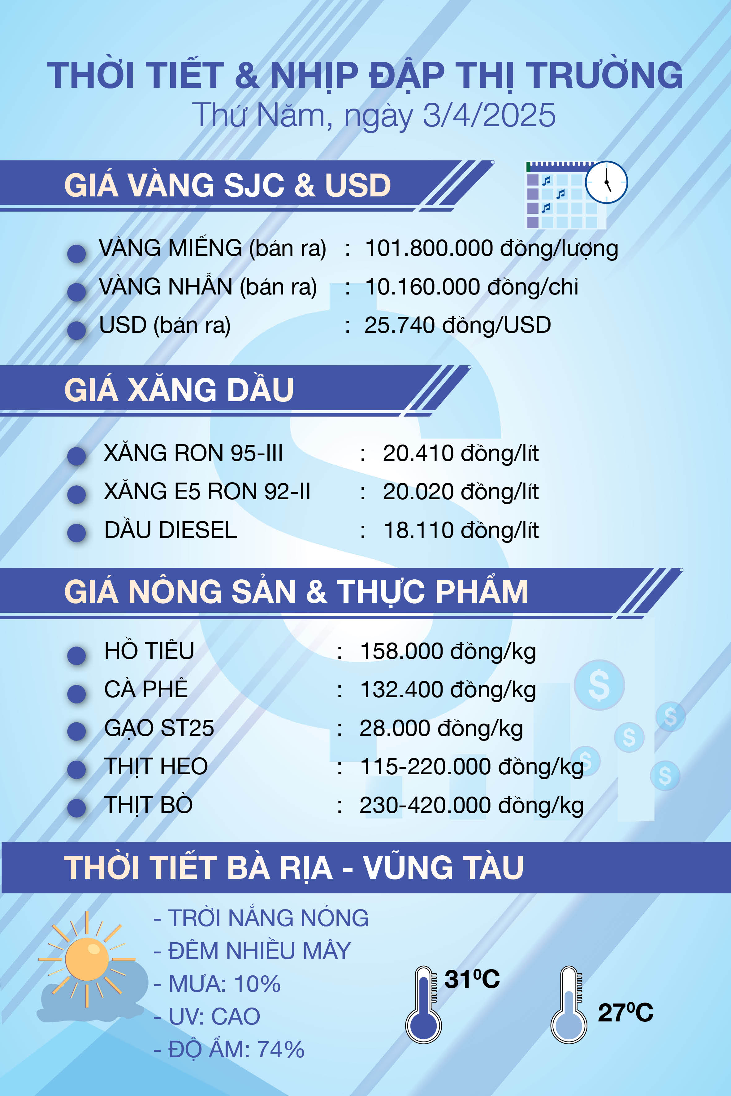 Cập nhật giá vàng, USD, xăng, một số mặt hàng lương thực, thực phẩm, nông sản và thời tiết hôm nay (3/4).