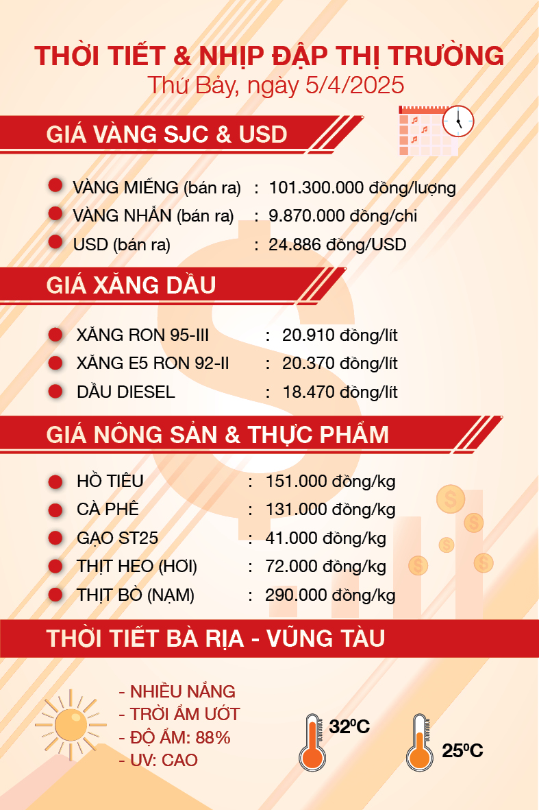 Cập nhật giá vàng, USD, xăng, một số mặt hàng lương thực, thực phẩm, nông sản và thời tiết hôm nay (5/4)
