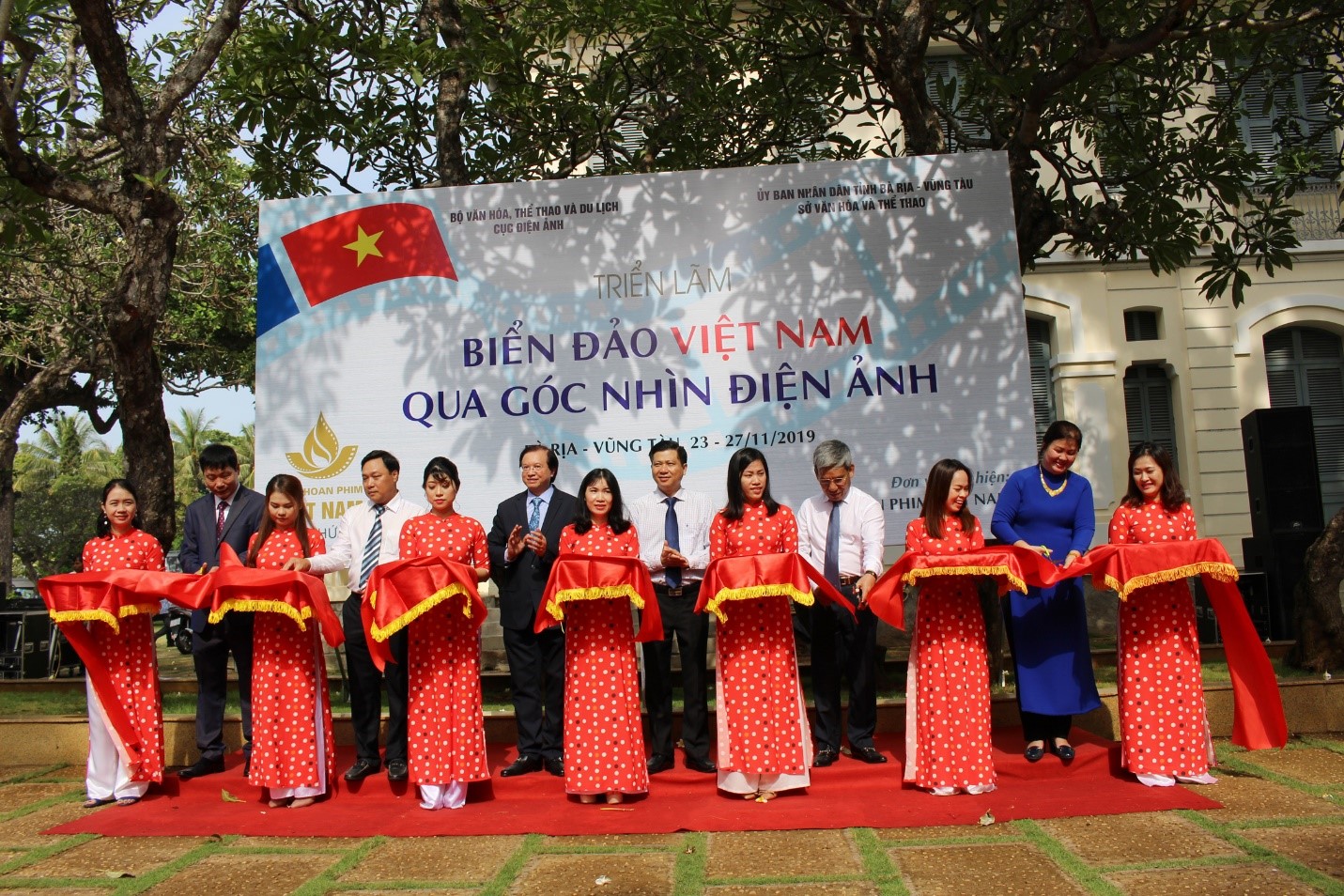 | Các đại biểu cắt băng khánh thành triển lãm hình ảnh biển, đảo qua phim Việt Nam. |