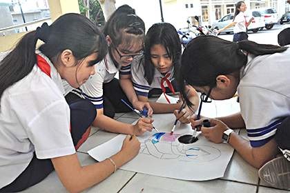 | Học sinh THCS thi vẽ tranh về đề tài ATGT. |