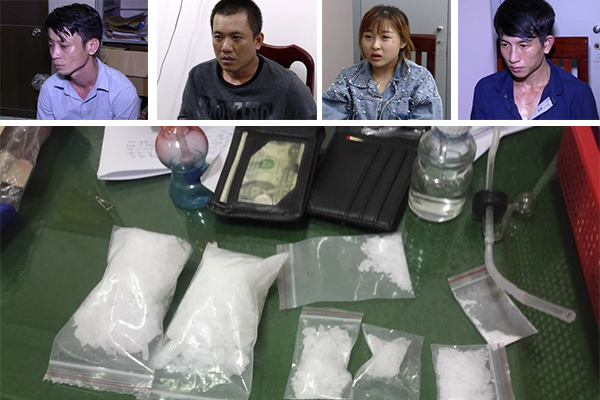 | Từ trái qua, đối tượng: Nguyễn Văn Linh, Lê Công Triệu, Chế Thị Mỹ Duyên, Phạm Quang Huy và tang vật vụ án. |