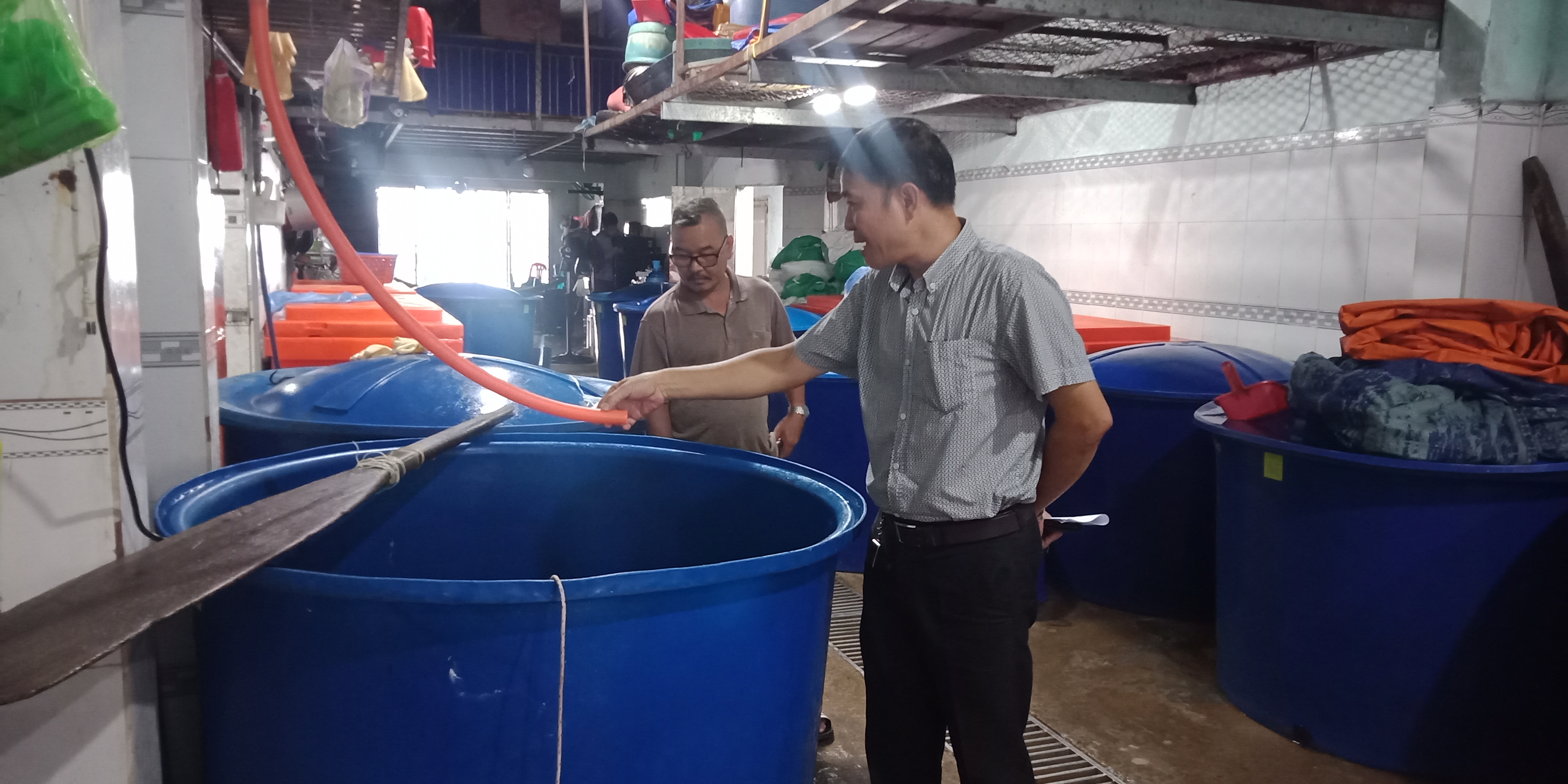 | Xưởng sản xuất của DN Bảo Thịnh có nhiều thùng nhựa loại lớn để đựng cá. Toàn bộ nước rửa cá đều được DN này cho xả thẳng ra môi trường, gây ô nhiễm nghiêm trọng. |