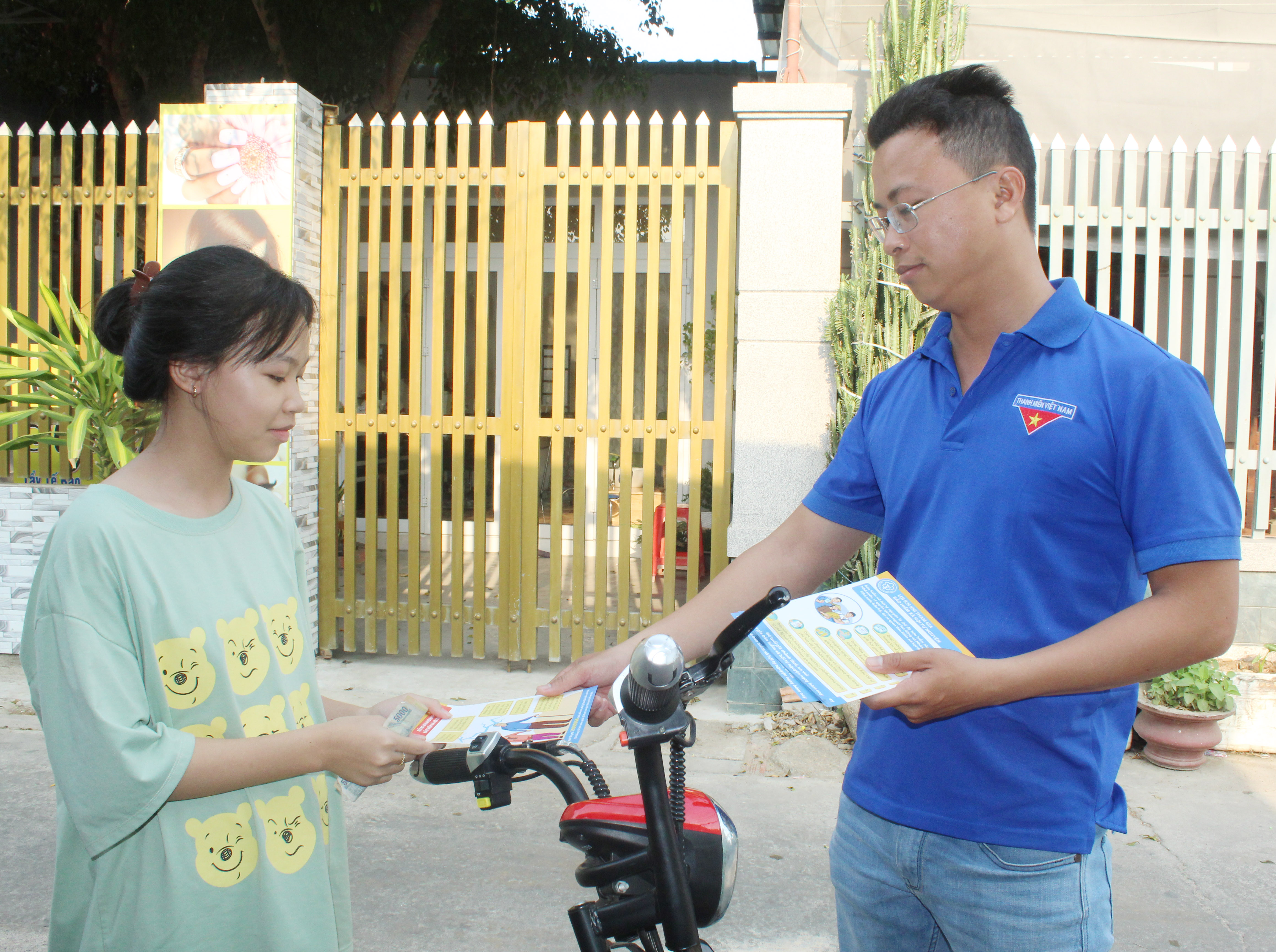 | Đoàn viên thanh niên phát tờ rơi tuyên truyền về Luật Giao thông đường bộ cho người dân xã Phước Hưng (huyện Long Điền). |