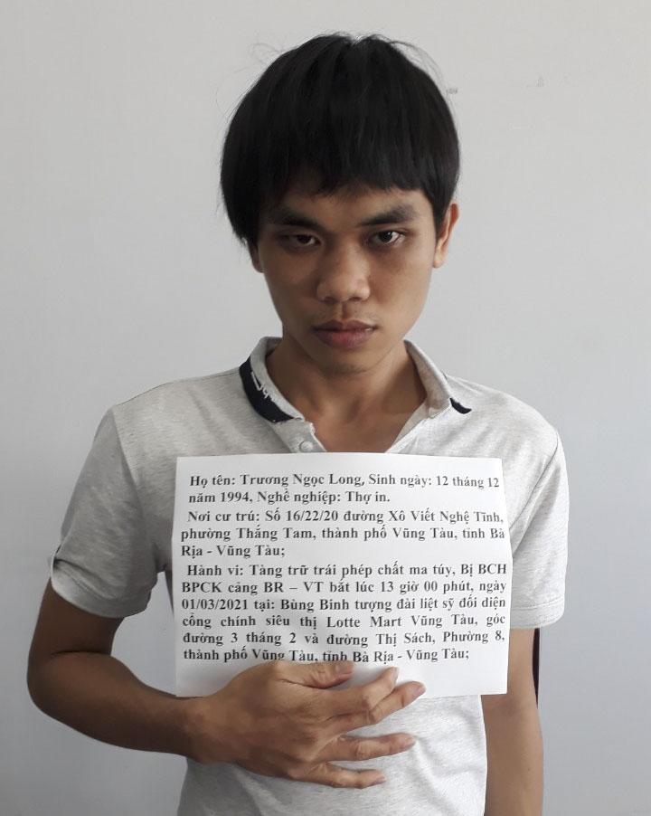 Trước đó, trưa 1/3, tại cổng Siêu thị Lotte Mart Vũng Tàu, lực lượng phòng, chống tội phạm ma túy Ban Chỉ huy Biên phòng Cửa khẩu cảng BR-VT phát hiện, bắt quả tang Long đang thực hiện hành vi tàng trữ trái phép chất ma túy.