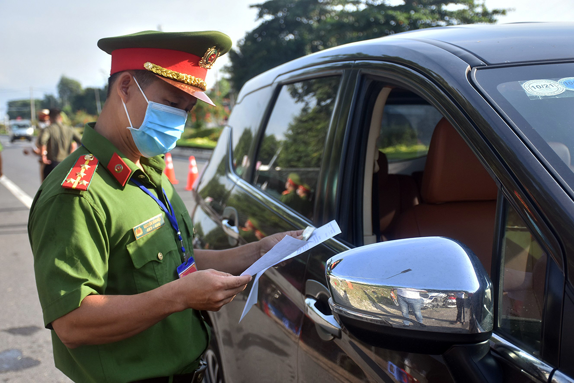 | Tổ công tác đặc biệt số 1 kiểm tra giấy tờ người điều khiển xe ô tô tại chốt kiểm soát y tế cầu Cỏ May, đường Võ Nguyên Giáp, TP.Vũng Tàu. |